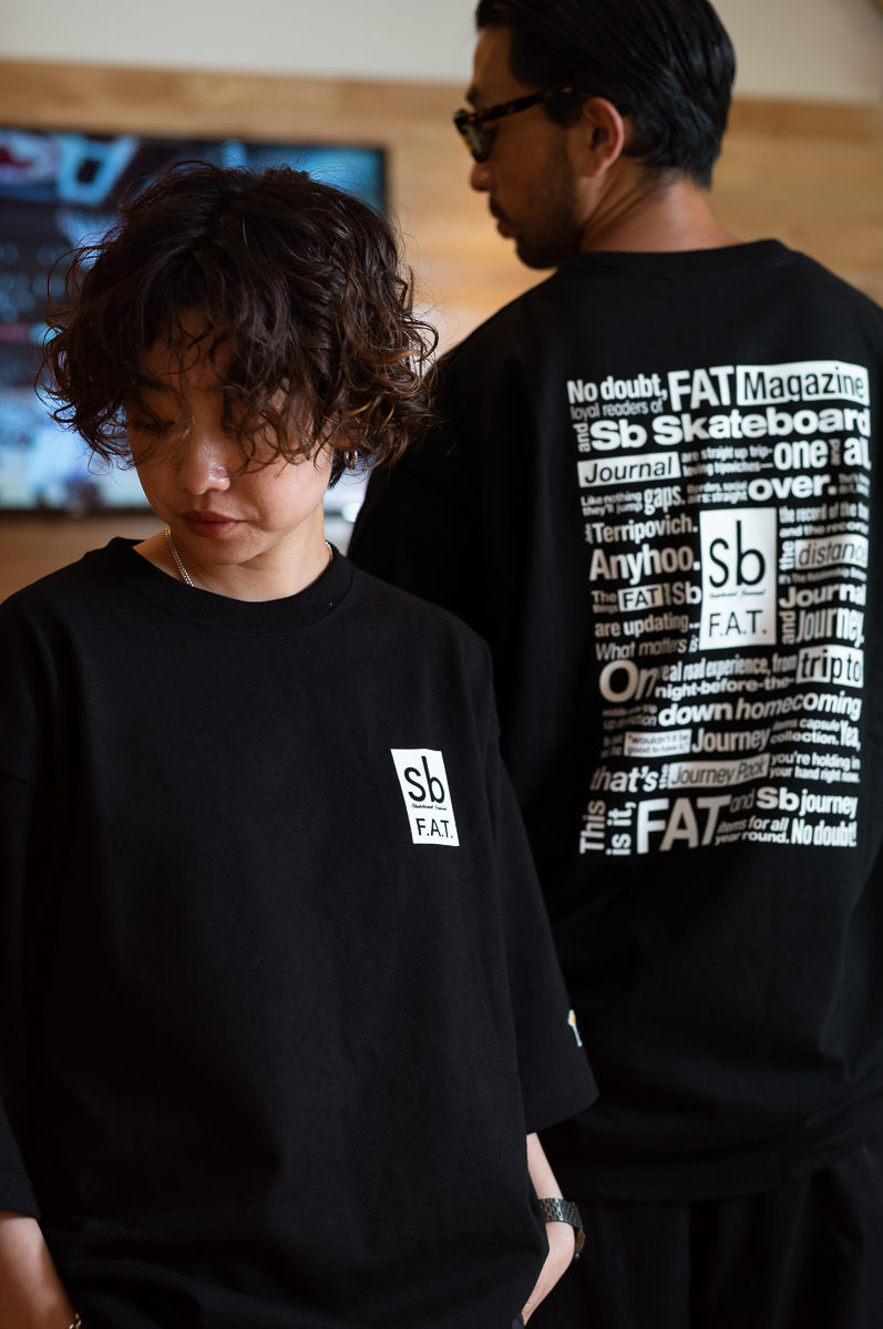 新宿ルミネエスト6Fに真夏の東京砂漠の蜃気楼のごとくオープンするFATの1月末までの期間限定POP UP ショップ、いや、FATでいうならNOSE BUMPでコチーンと出現するショップ。限定でリリースされるT-shirtがこれ。E.T.が動くカラ揚げなら、これは着るショッパー。F.A.T. x Sbのジャーニーパックのアイコン的なショッパーというかパッケージというか、とにかくそんなやつをバックプリントにしたT-SHIT!!! Sbは、もともとデザインの主役として、和洋問わず文字の羅列や文章のブロックを大事にしてきたので、それを彷彿させる1枚に。