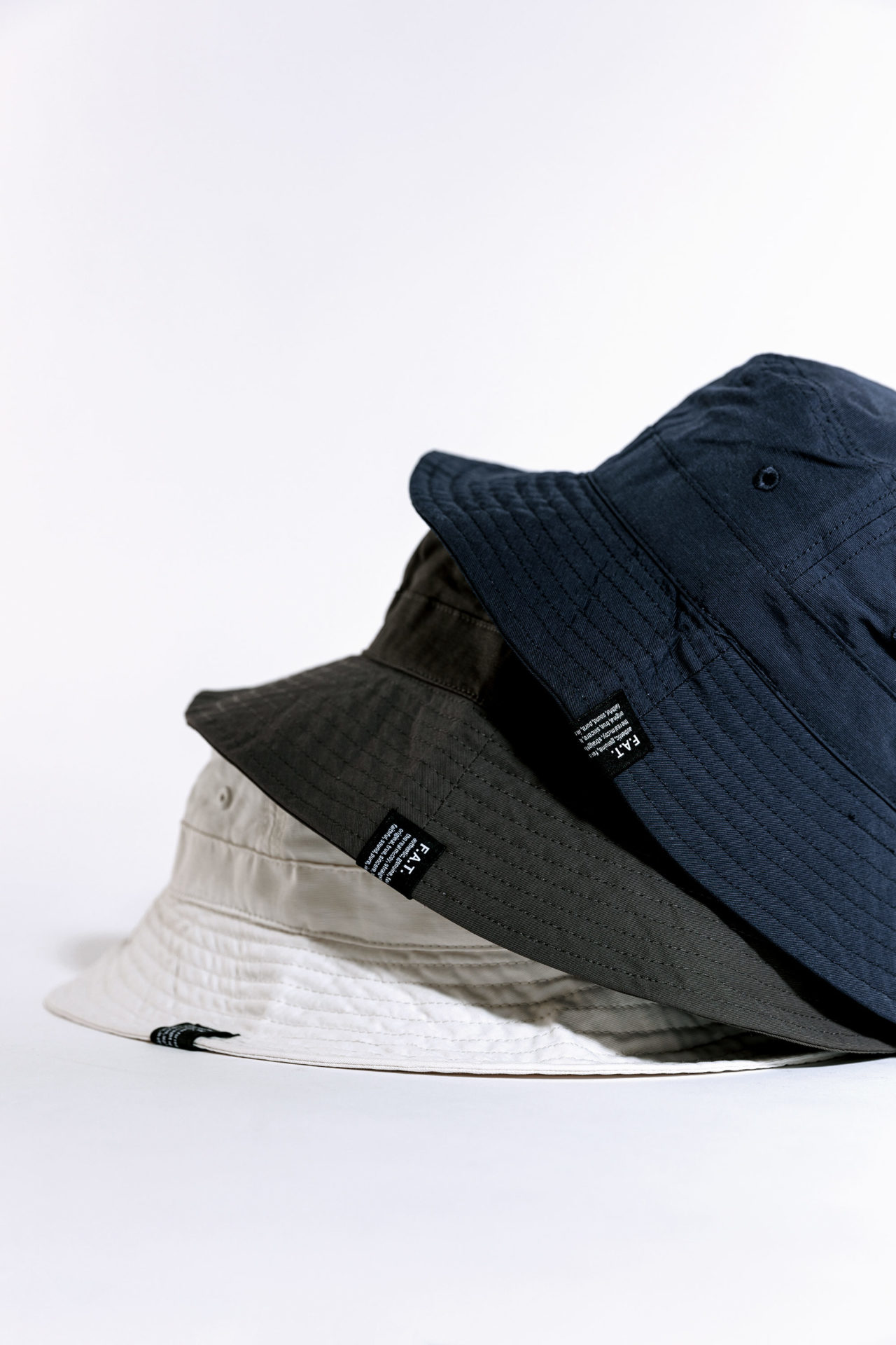 コットンナイロンクロスを使用したバケットハット。ハットといえばの定番デザインで、どんなスタイルにもハマるのがポイント。一見ミリタリーハットとほぼ同じデザイン?と感じるかもしれませんが、ツバの長さが違っていたりするのも特徴。一度お試しを、ぜひ!