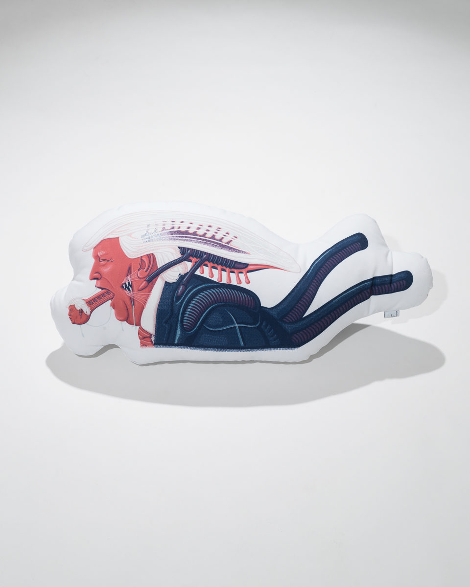 ローカルのカルチャーのための良いショップ。店舗部分は小さくてもその奥にお手製のスケートパークがある。壁にはローカルのアーティストが描いた大きなグラフィック。スキルと年齢にかなりバリエーションがある客層。そして、ショップのスタイルやシンク・タンクを証明するオリジナル・アイテムがフルプッシュされている。コモンウェルスにはそのすべてがあった。さらには、おらが町のスケボーショップに共通する畏怖のようなもの。それは、シークレットスポット近くのサーフショップや、ベニスビーチにあったDOGTOWN所縁のジェフ・ホーのお店などと同じで、初めて入店するときに軽い目眩を覚えるものだ。怖そうとか近寄りがたいスタッフがギロリと一瞥してくるだけの店。ろくにスケボーも知らねぇくせに来んなとか、おまえどこ中?(中学)みたいな。それが、通ううちにスケボーのことだけでなく、それにまつわる音楽や遊びなんかも教えてくれるようになる。それが楽しい。足元ブルブルのキッズはとくに。そんなすべてがあって、すべてが良い、コモンウェルスとF.A.T.の一番ふざけたアイテムがこのクッション。例えば、カウチでリラックスして、素敵映画を見ている彼女の傍らには、エイリアンなトランプ。例えば、仲間とロードムービーしてて、後部シートで白熱した政局トークを繰り広げているトムが抱えているのはエイリアンなトランプ。オー・マイ・ゴッシュ。そんな感じ。バーニーがジェダイ・マスターならトランプはダースベーダー。バーニーがノストロモ号の船長ならトランプはエイリアン。コモンウェルス流のコントラストが最高にイカしている。ふざけているけど、考えている。眉間にしわを寄せて難しいことリプするより、口角上げて笑って自分をブラッシュアップする。そんなコラボレーションをどうぞ!