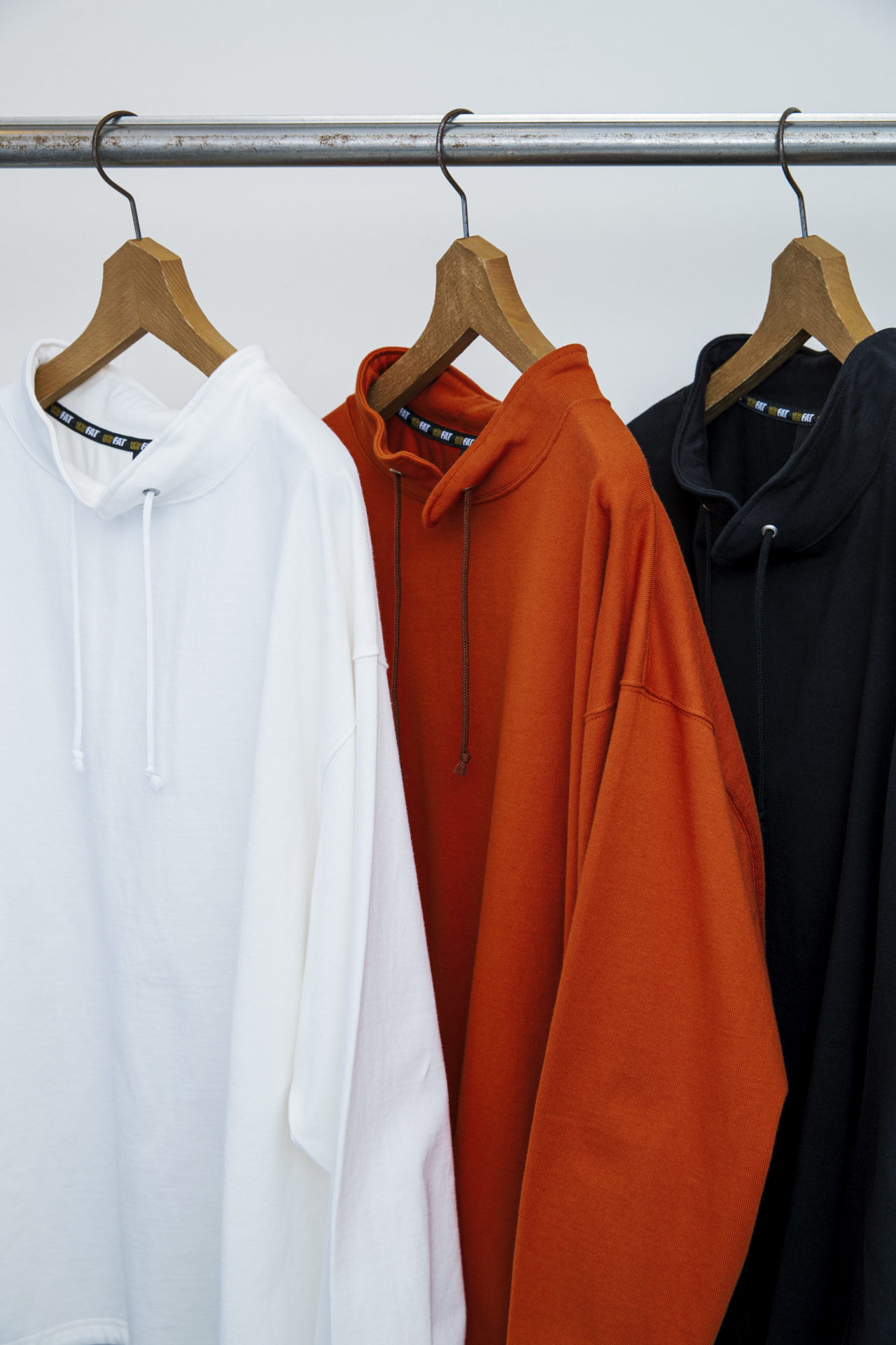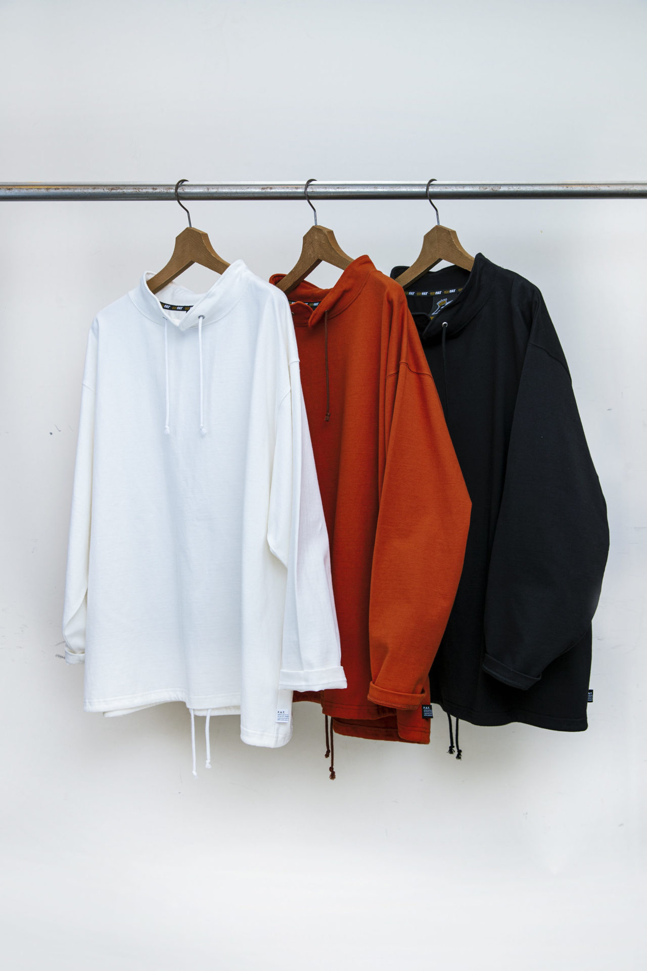 FATの定番13ozの肉厚生地を使用したカットソー。もはや定番!?のビッグシルエットで仕立て一枚で着たくなる衝動に駆られる存在。先割れたモックネックというデザインに、同色のドローコードをスタンドカラー、裾に備えることでシルエットに変化も出せる。ディヂューアンダースタンド?絞りますか?絞りませんか?ほら、合わせてみればあんたスラッとして見えるから。ぜひ!