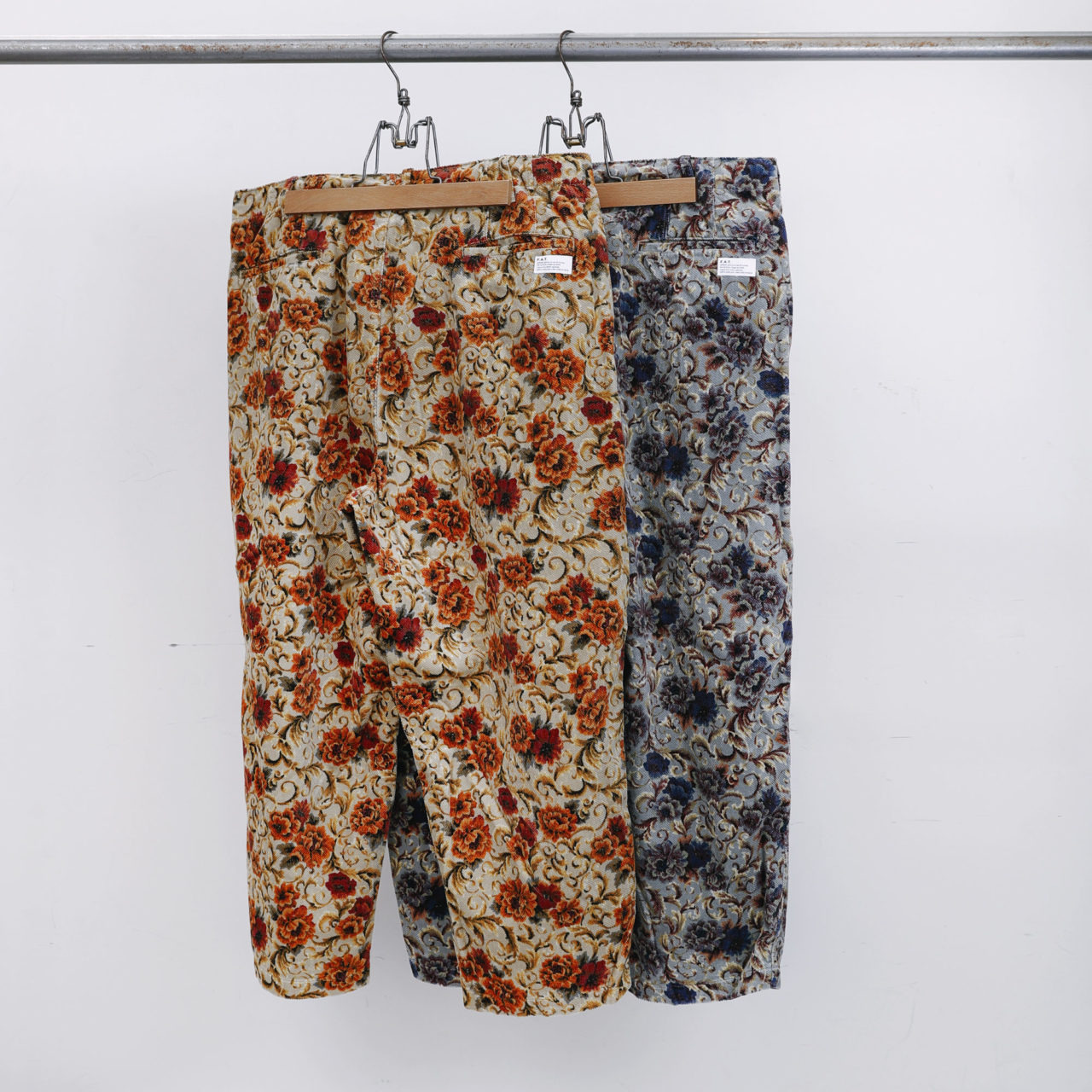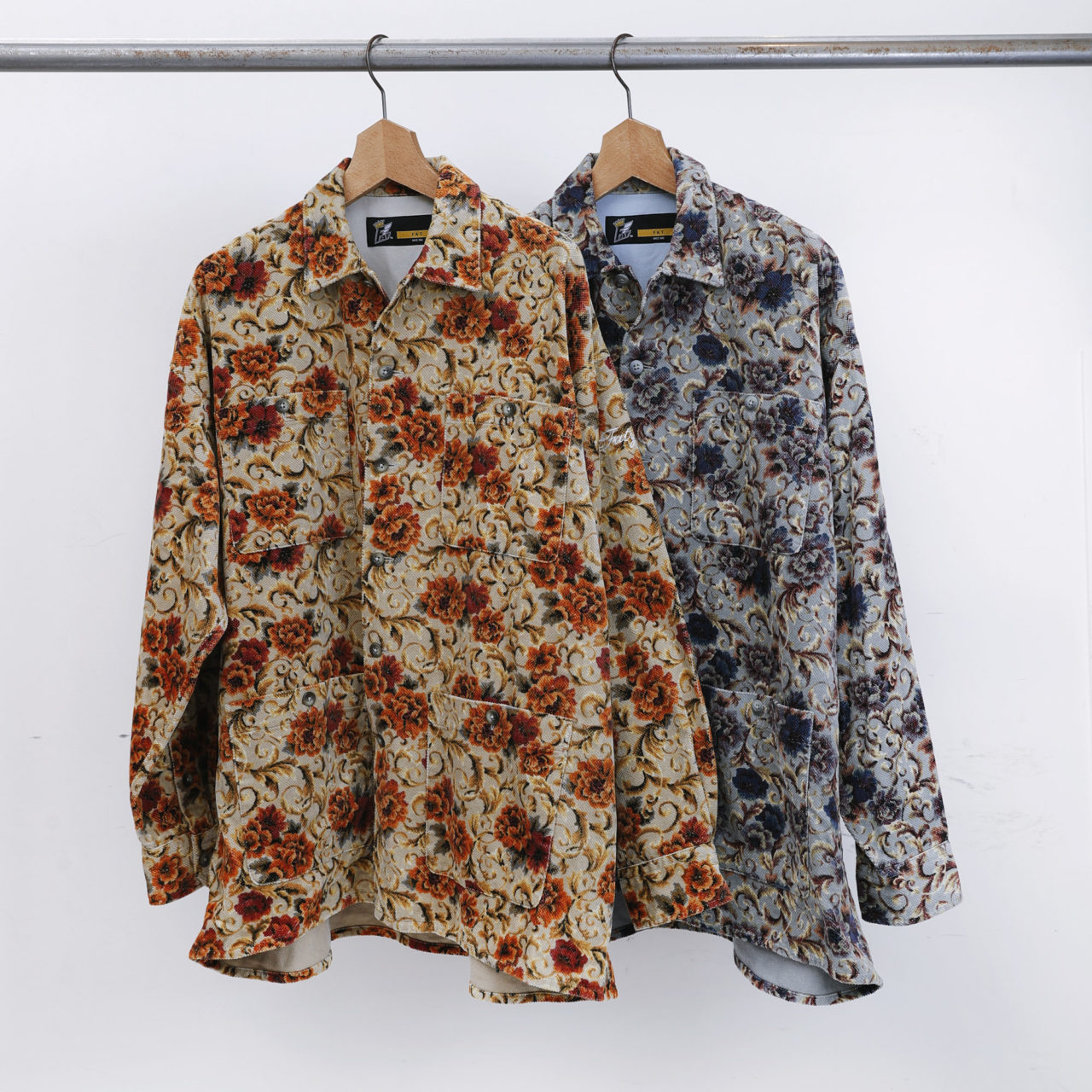 パッと見で印象強い花柄の生地で仕立てられたセットアップもスタンバイ。フロントにポケットを4つ備えたこちらもビッグシルエットのシャツと、ワイドシルエットのパンツで展開。暖かみのある素材は、お米の粒が合わさっているかのようなライスコールと呼ばれるコーデュロイ素材。メルヘンチックなんて言葉では片づけられない、お箸と茶碗を持って来てもお米は出ない、出るのは着た時の自身の存在感。セットアップでもそれぞれ単体でも好きなように来ていただければ!一度お試しを、ぜひ!
