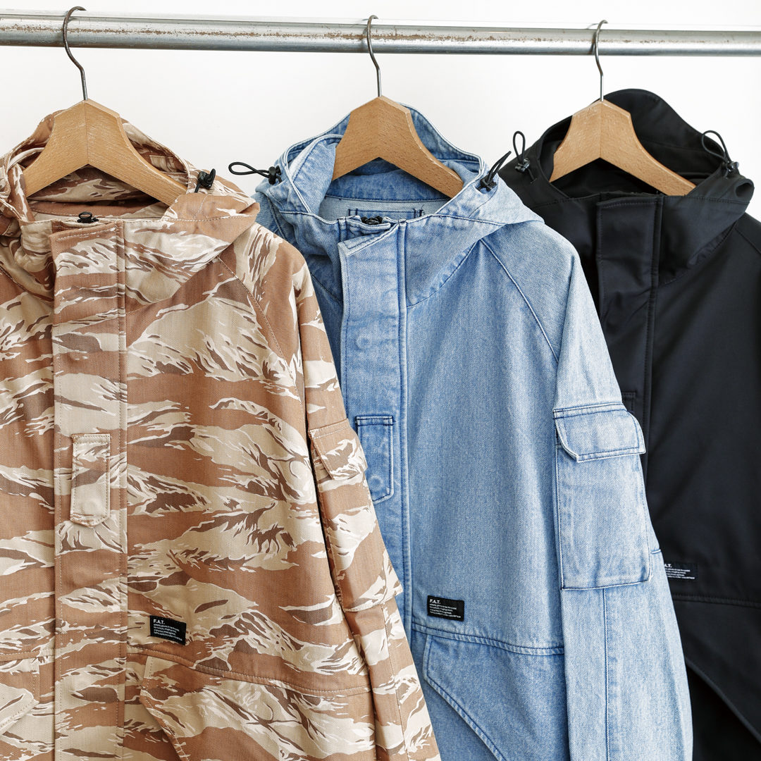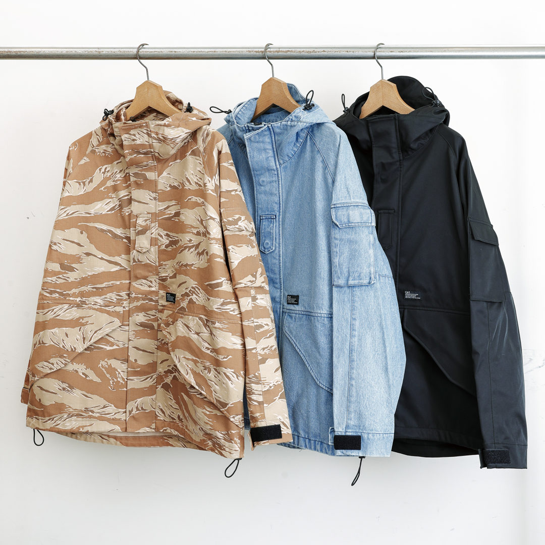 1980年以降に米軍で採用された極寒地向けのレイヤリングシステムとかなんとか。街中で着るならそこそこ着込めればイイ。フード一体型の1stタイプをベースにデザインし、インナーにはTシャツからロンT、スウェットやフリースだって合わせられるそんなジャケットがコレ。ソリッドなBLACKはボンディングクロス、洗いをかけたデニム素材のBLUE、ザ・ミリタリーなデザートタイガーストライプの3色展開でそれぞれ素材が違う、選べる楽しみ。さてどの素材にしましょうか?一度お試しを、ぜひ!