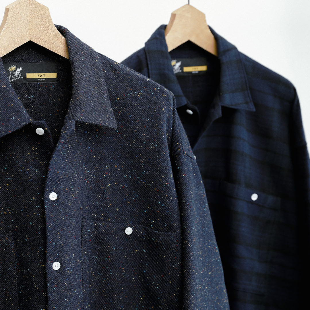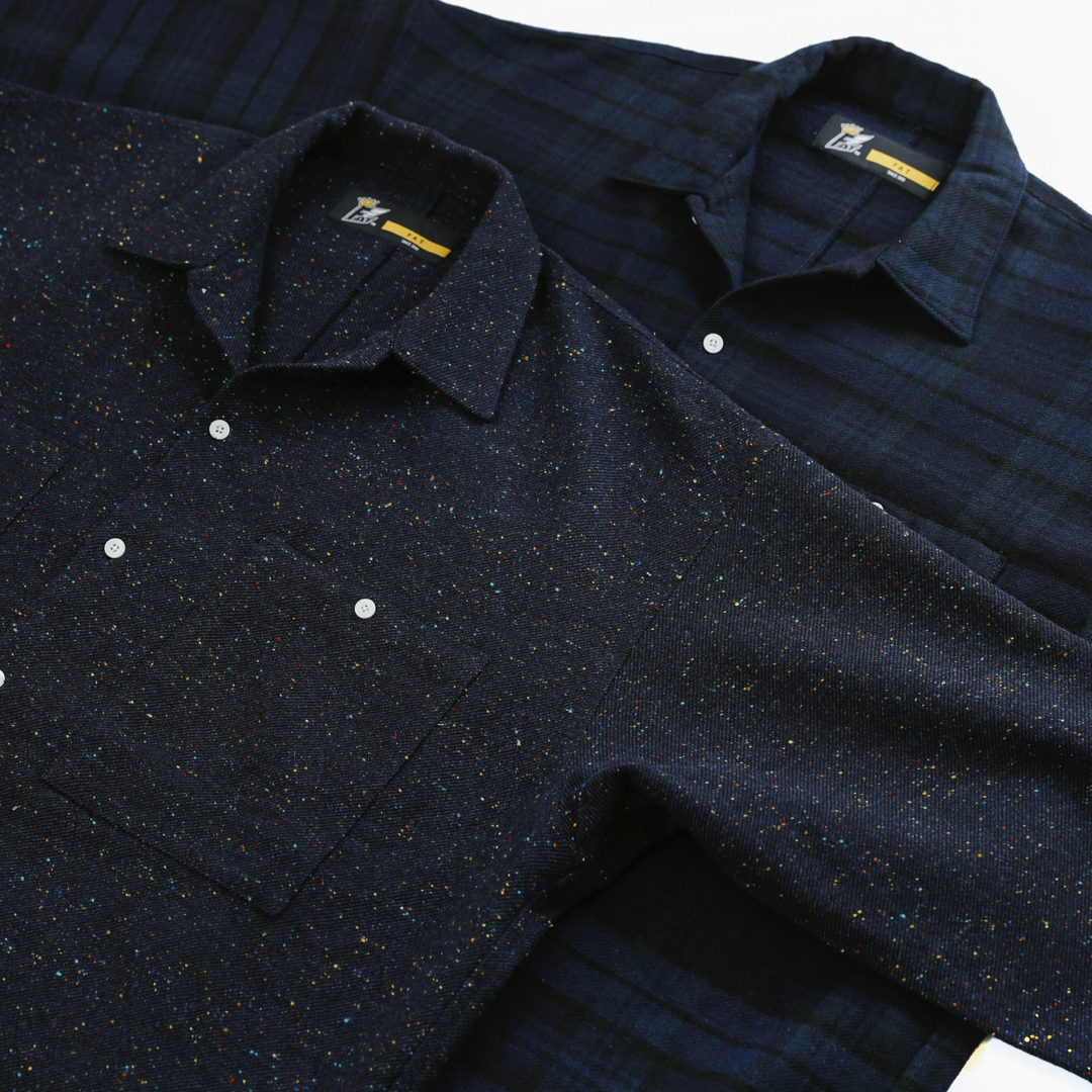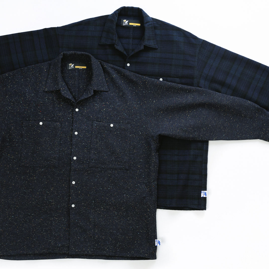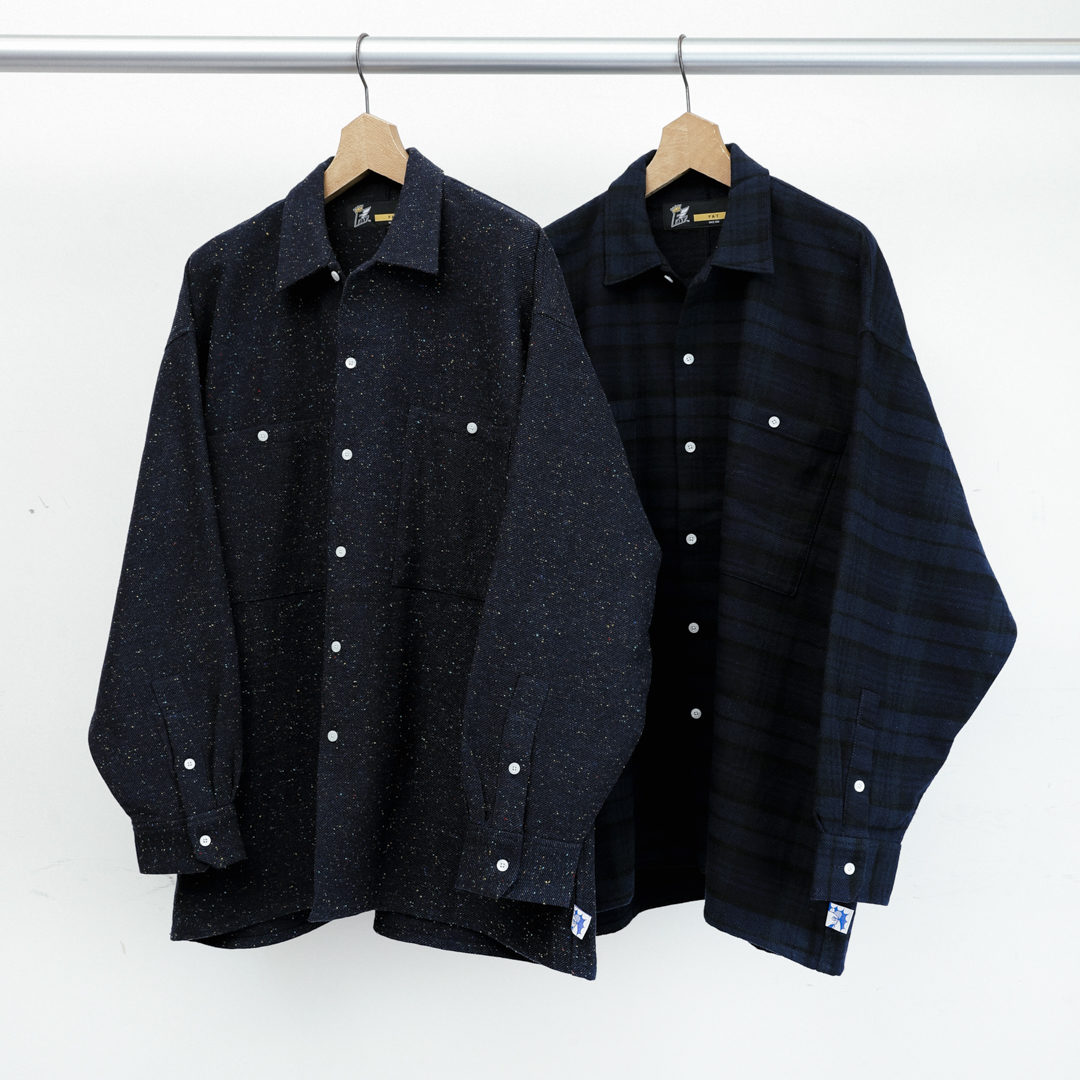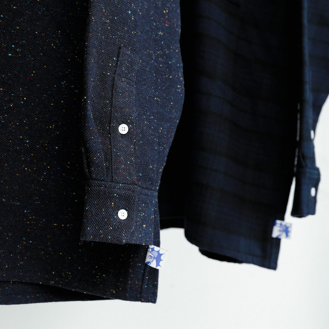 ネイビーブルーで展開するウールフラノのBIGシルエットシャツ、こちらも1色での展開と思いきや、細かくマルチカラーをネップ状に細かく散りばめた星空のようなネイビーと、ソリッドに見せて実はタータンチェック柄が隠れた、歌舞いている感が出る2色展開。インでもアウトでも切られる独特のシルエット、背中を一刀両断したかのような切り替えと共に裾のSHUTIEネームにも注目頂きたい仕上がり。一度お試しを、ぜひ!