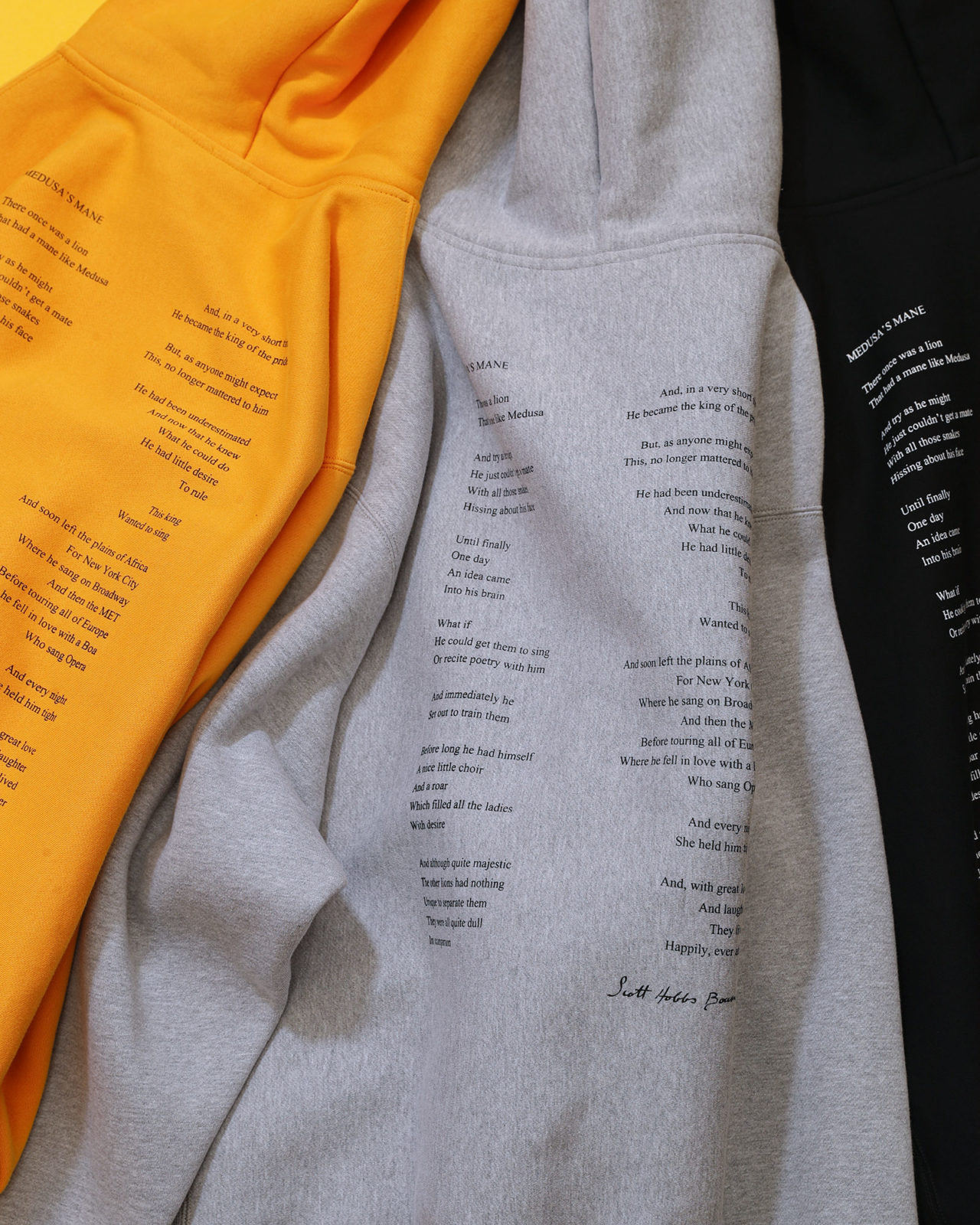ギリシア神話のゴルゴーン三姉妹のひとり、メドューサを彷彿とさせるキャラクターが目をひくスウェットパーカ。バックにはスコットの文章をそのままプリント。3色あるけど、Sb推しは断然にイエローボディ。F.A.T.のブランドカラーとSbの創刊号のカバーの配色を彷彿とさせる1着。