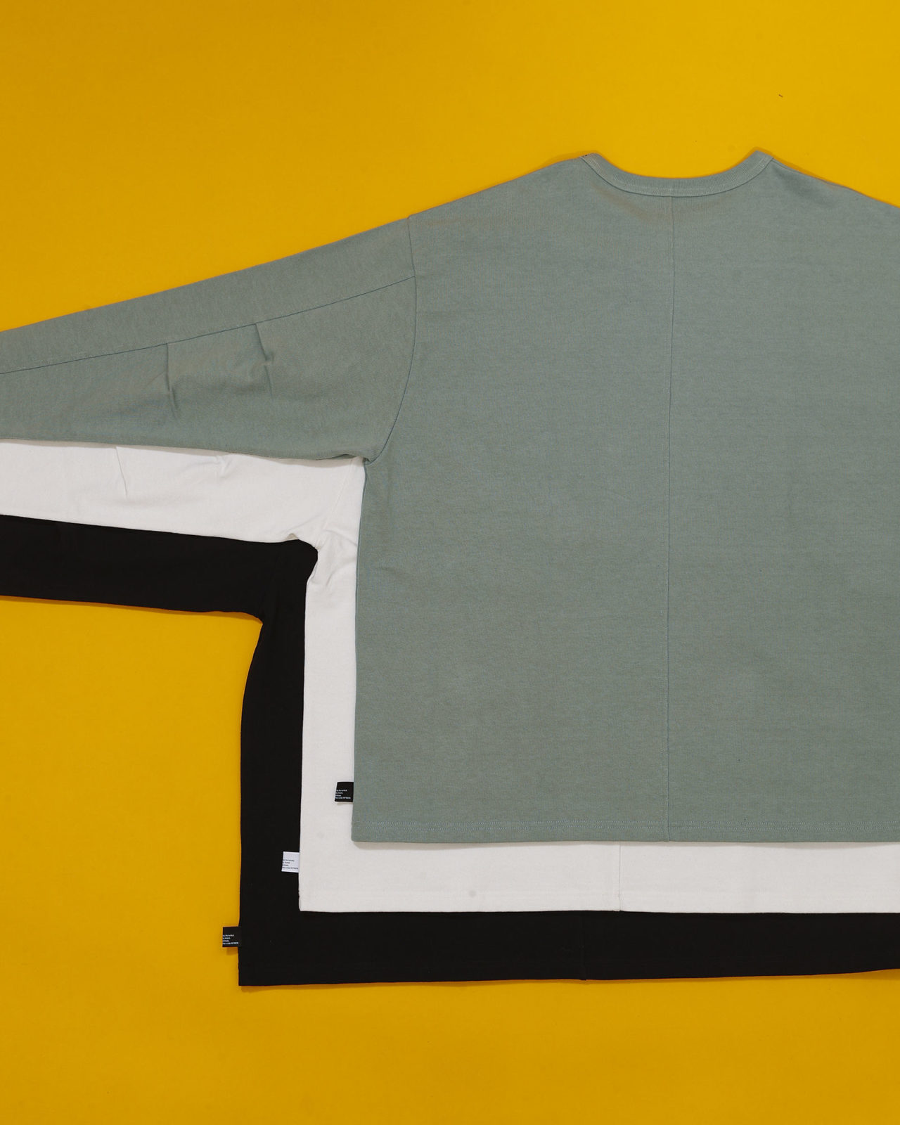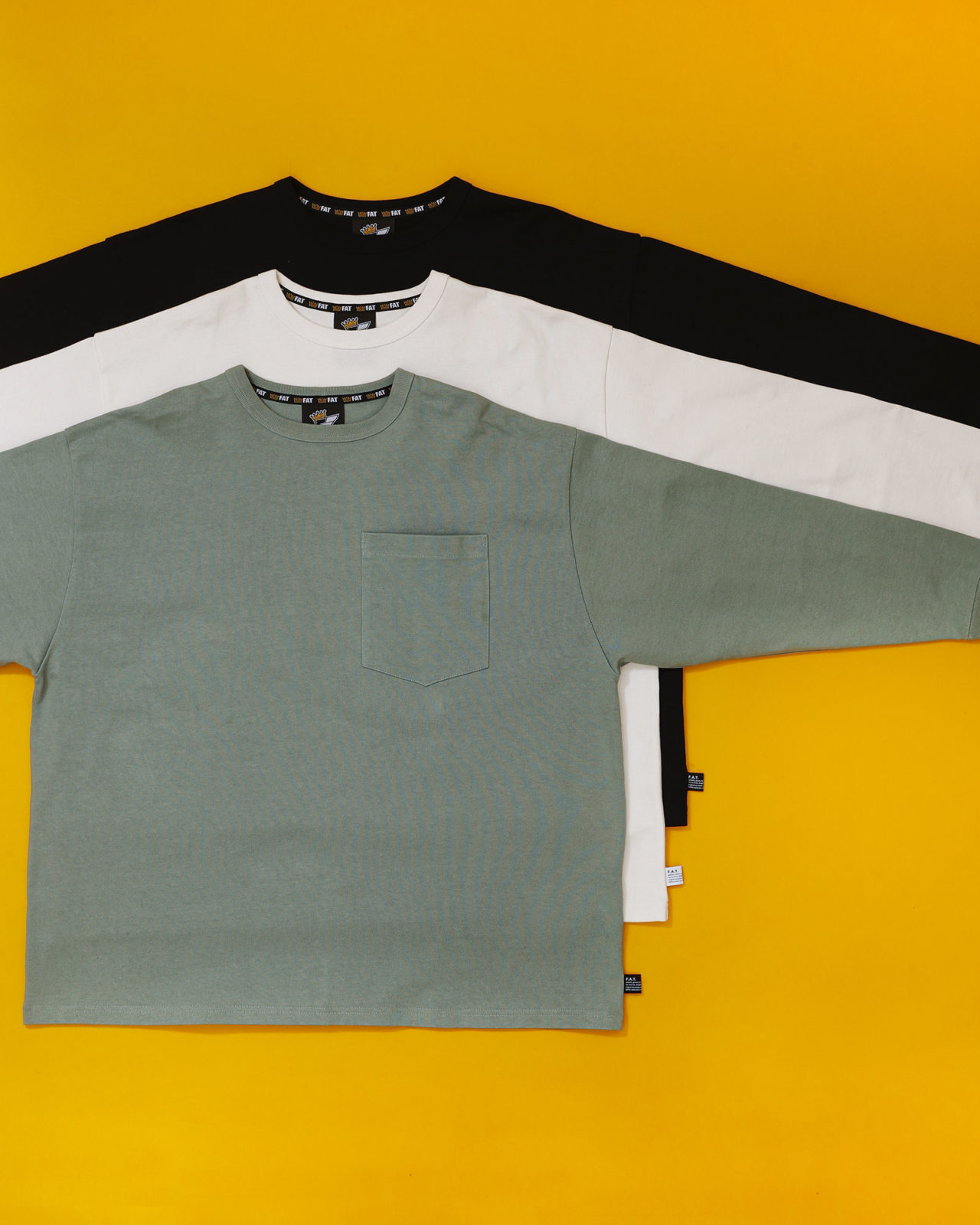 FAT定番の13oz生地を使用したBIGシルエットのロンT。シンプルで良いよね、なんかポケットまで大きいし。シンプルで良いよね、背中や袖のダーツがどこかミリタリーっぽさを香らせるから。一回着たらやめられない、癖になる。みたいなクサイことは言わないけれど、似たようなアイテム持っててもなんか欲しくなるディテール。今季シーズンテーマ”TRIPLE DOUBLE”に乗っかり2枚、3枚言っちゃって欲しいアイテム。こっちの方がクサイか?一度お試しを、ぜひ!