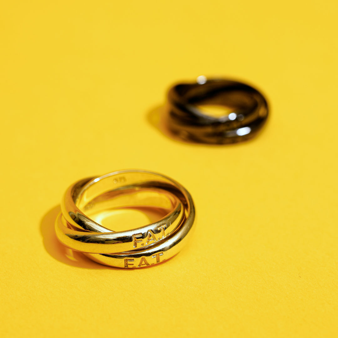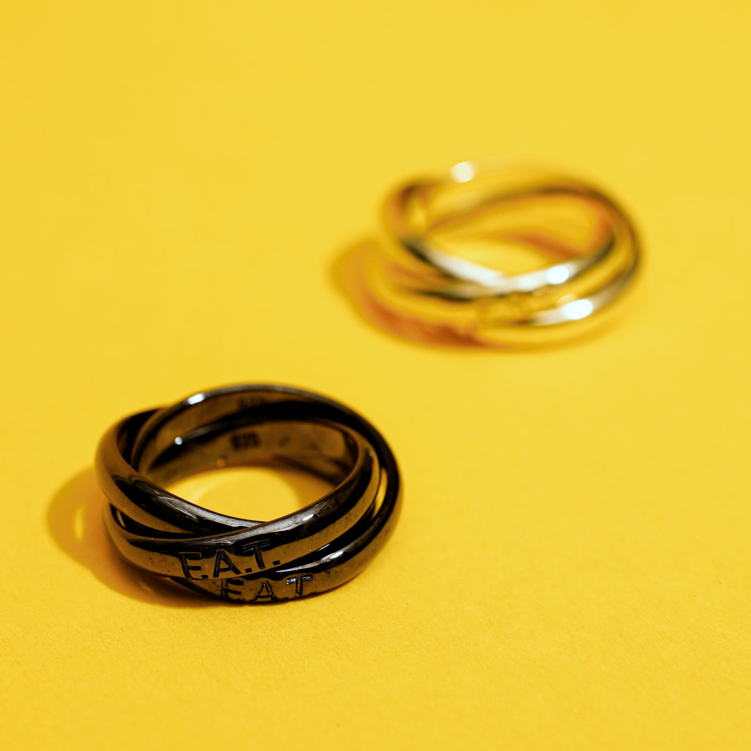 3 is a Magic Numberではないけれど3連リング。FATらしく黒と黄色、このGOLDとBLACKで展開。外れそうで外れない。エタニティっていうか、トリニティっていうかアイデンティティ溢れるリング。表向きはピンキーリングとして提案していますが、9号、13号の2サイズを用意しているので、男性、女性、どの指問わずフィットするところへ合わせていただければ!一度お試しを、ぜひ!