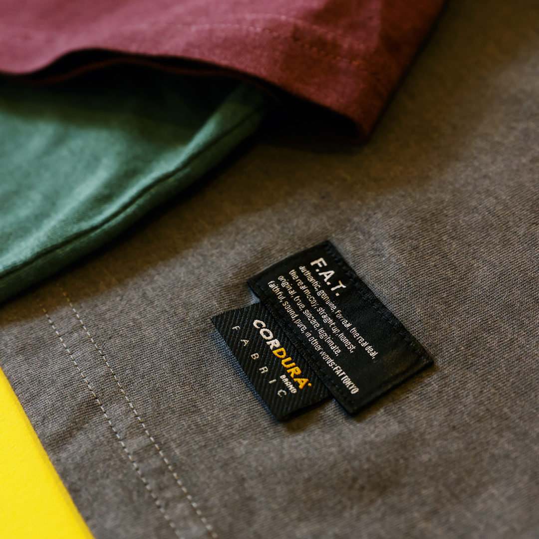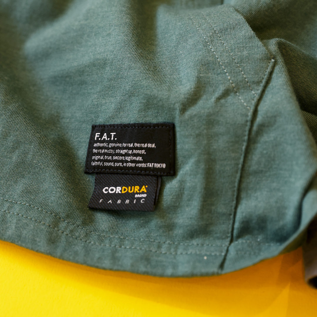F.A.T.定番の13ozではなく、特別薄いわけではない、いわゆるTee素材。そこにコーデュラナイロン混紡したしなやかな質感。経年使用で通常だとクタっとやれていくところをカバーする耐久性、といったタフさを兼ね備えています。