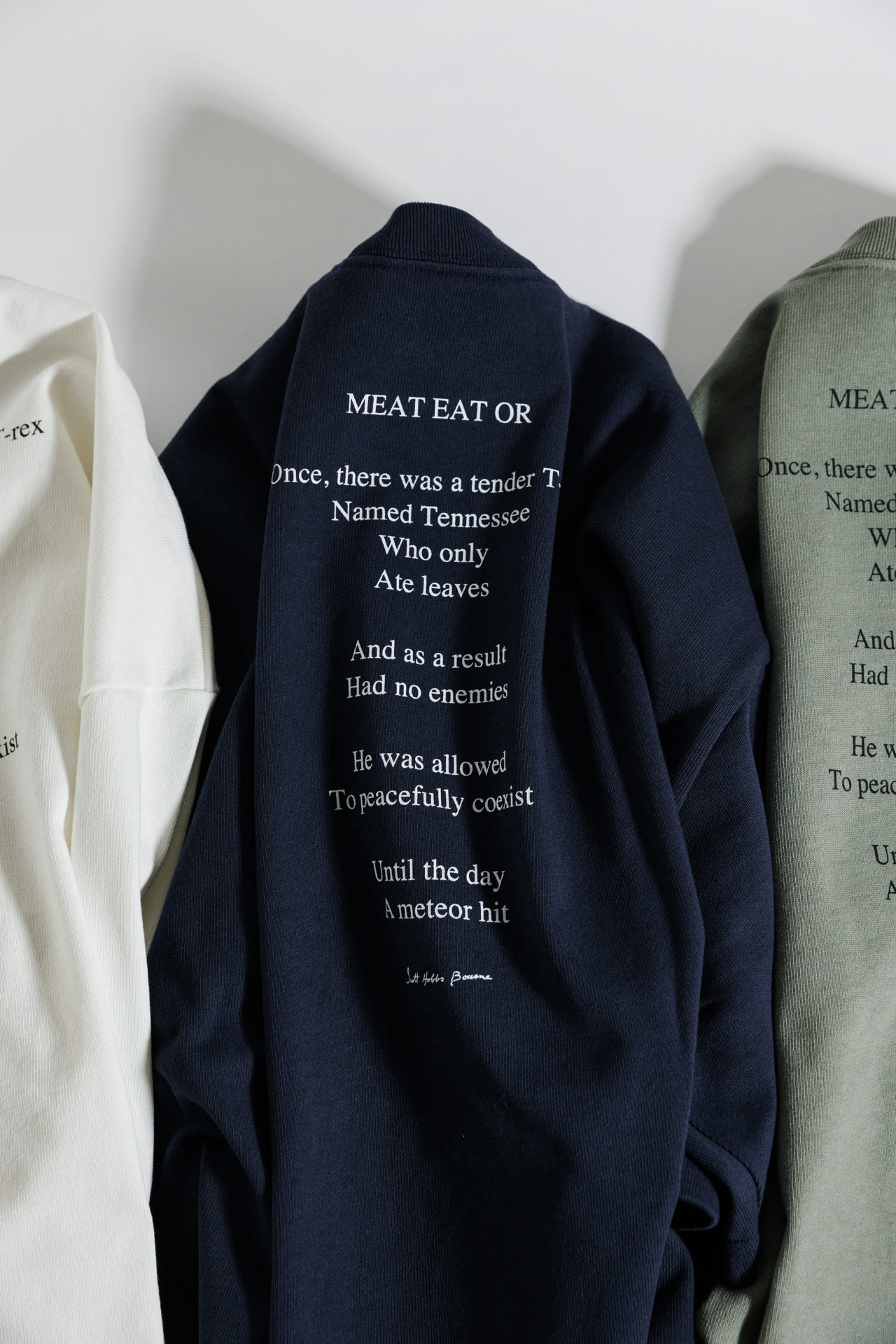 アーティストのToddと作家のScott、そしてともにスケーターの2人による長編絵本『An act of Imagination』の登場キャラクターより、MEAT EAT ORが登場。絵と文章のどちらもまとう13オンスTシャツ。本編ではモノクロ・キャラのMEAT EAT ORも、今回は彼らの提案によりカラーバージョンで登場。