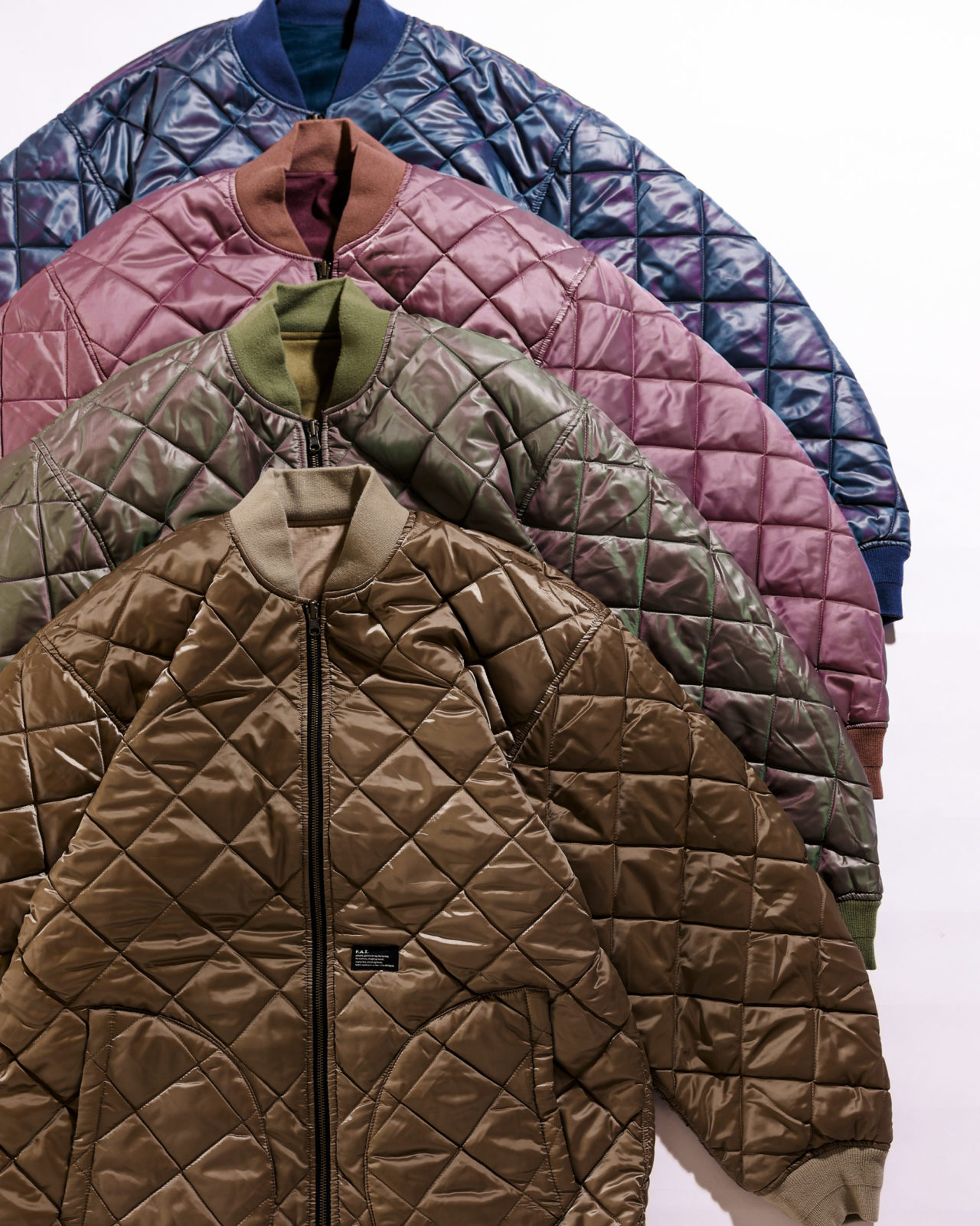表面にフェイクスウェード素材、デザートカモ素材を使用し、裏面にナイロンツイル素材を使用したリバーシブル仕様のブルゾン。米軍で40年代に採用されていたM-43ジャケットライナーをデザインベースとし、リブ襟やミニマムなデザインが特徴。裏返せば光沢あるポリエステル素材のダイヤキルティングのジップブルゾンとして着用でき、1着で2通りのスタイリングを楽しめるアイテム。また、デザインベースとしてライナーを用いていますが、アウターとしてインナーにスウェットパーカーなど着込むことも可能。一度お試しを、ぜひ!