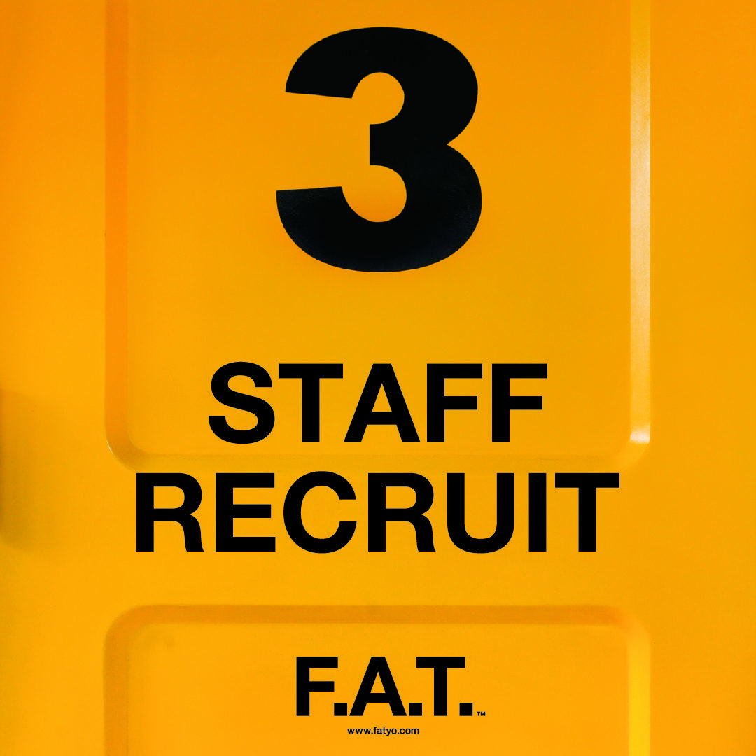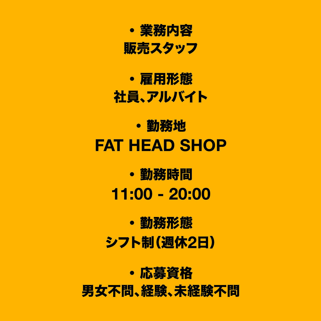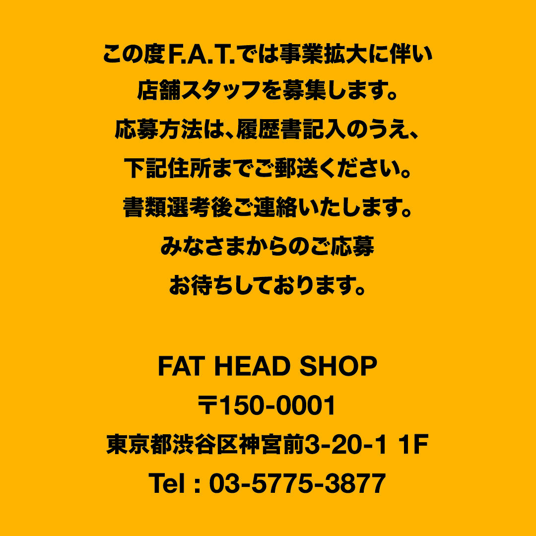 この度F.A.T.では事業拡大に伴い店舗スタッフを募集します。応募方法は、履歴書記入のうえ、下記住所までご郵送ください。書類選考後、こちらよりご連絡いたします。みなさまからの、ご応募お待ちしております。