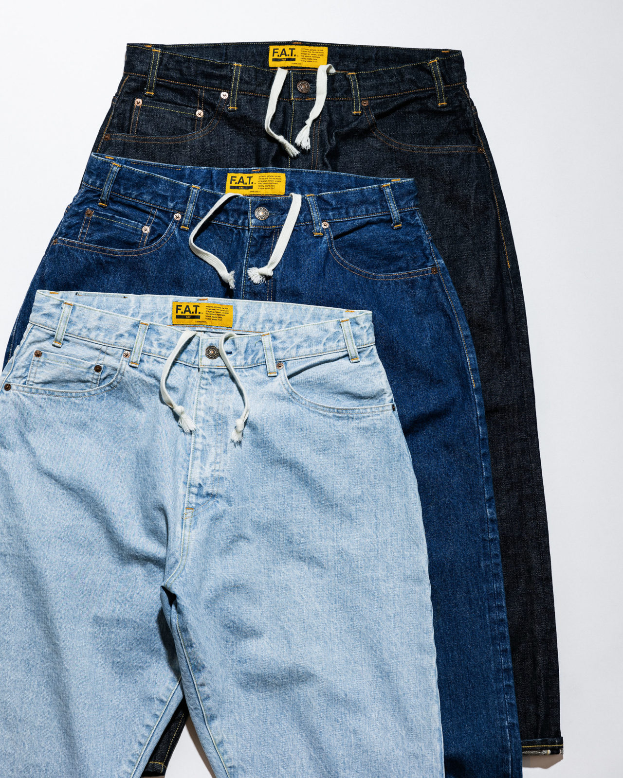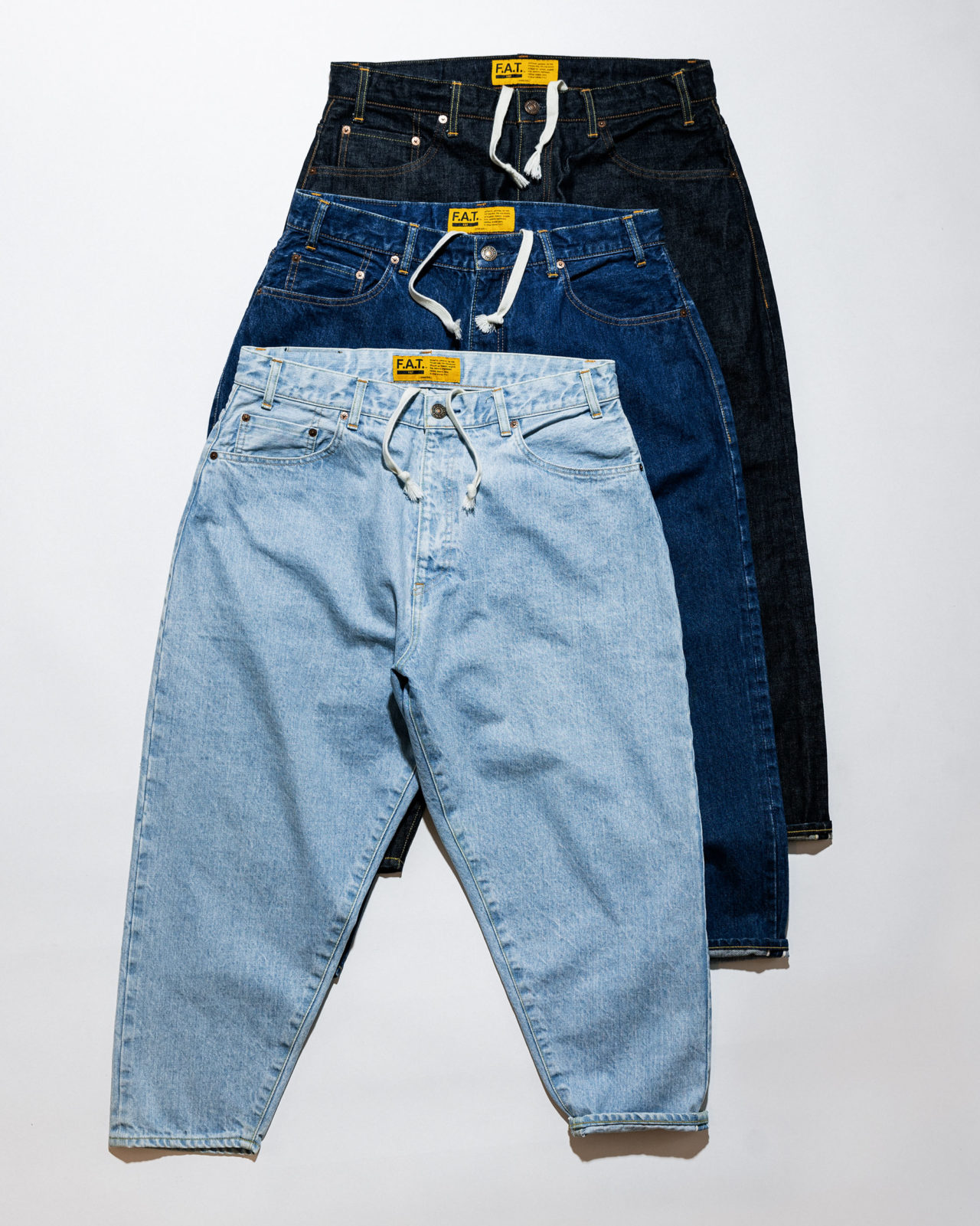 247は米英語で、1日の24時間と1週間の7日間を足し「Always = 毎日」毎日穿きたいデニムをコンセプトに”247″をデザイン。名前が示す通りFATを代表するデニム。14ozの国産セルヴィッチデニムを使用し、オーセンティックな縫製にこだわった1本。これまでのディテールをブラッシュアップし、股上を深く、渡りを広くとることによりヒップから膝にかけてボリュームを持たせたワイドテーパードシルエットに加え、9分丈レングスはどんなスニーカーとも絶妙なバランスで合わせられる。ウエストはドローコードを備え、ベルトレスでイージーパンツとして着用可能。カルチャーをもMIXした拘りの詰まった1本。 新しいタグでこれからも定番としてリリースするデニム。ワンウォッシュとは異なる雰囲気の”247 FADER”は好評の”SAX”と”BLUE”を継続して展開。お試しを、ぜひ!