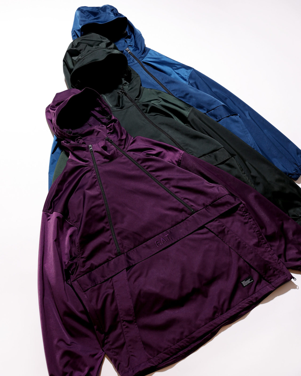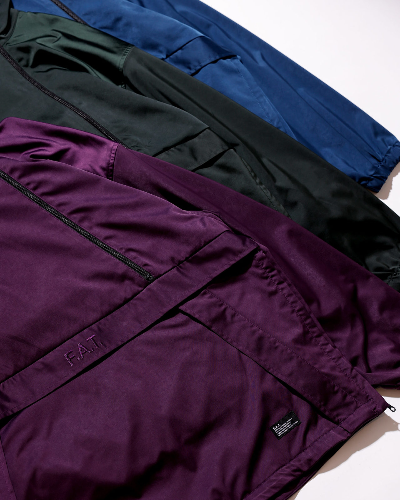 マットな質感があり、ポリエステル素材の持つ光沢感を際立たせる独特の発色と、同色で揃えたブランド刺繍もさりげなくアクセントになりますが、何より暖かくなっても着られる素材感。インナーにスウェットなど厚手なものも合わせられるサイズ感にも注目してください。ぜひ!!