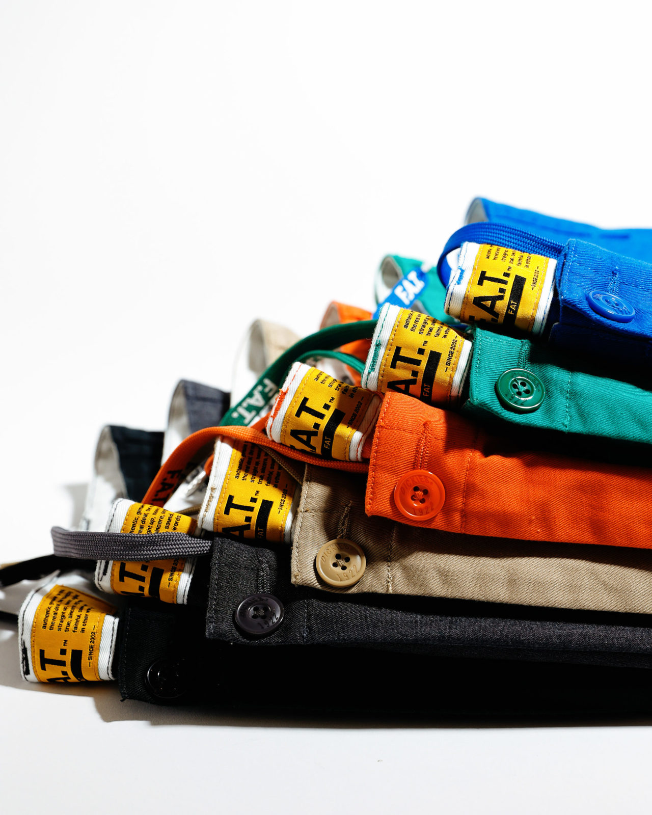 DickiesオリジナルのソフトT/Cツイルを使用、センタークリース、フロントにワンタックを入れ、股上はやや深め、渡りはやや太めにしつつ腰回りはすっきりとさせたF.A.T.独自のストレートシルエット。