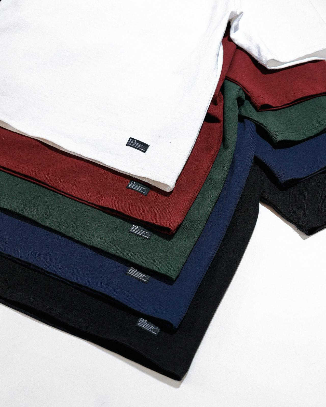 グラフィックが入らないソリッドな、ブランクのTシャツも用意。デザインすることをあえてしない。それがデザイン。久しぶりに店頭に並ぶプリントもポケットも付かないシンプルでいて明朗なTシャツ。F.A.T.ではレギュラーシルエットとして肩幅、身幅にゆとりを持たせたサイズ感をキープしてのリリース。今季はこれまでのピスネームから裾にブランドタグのみ配したデザインに。