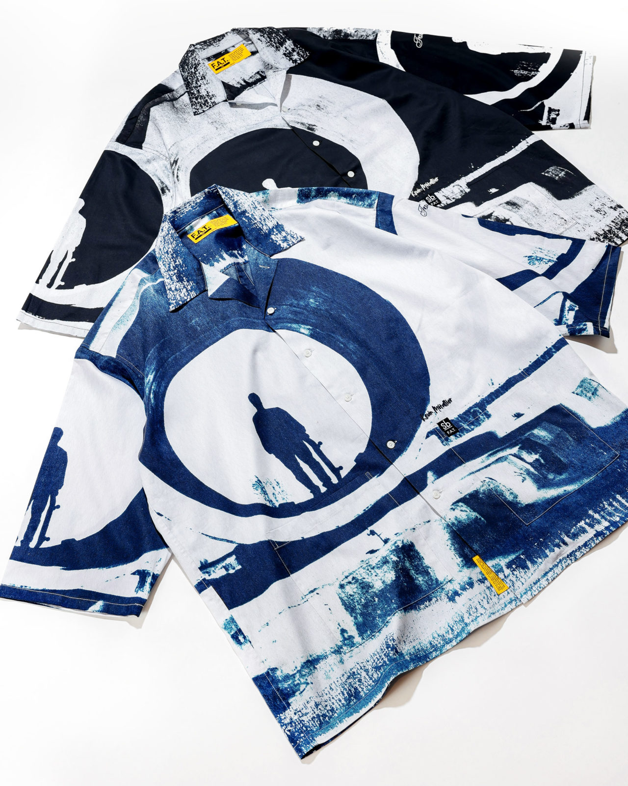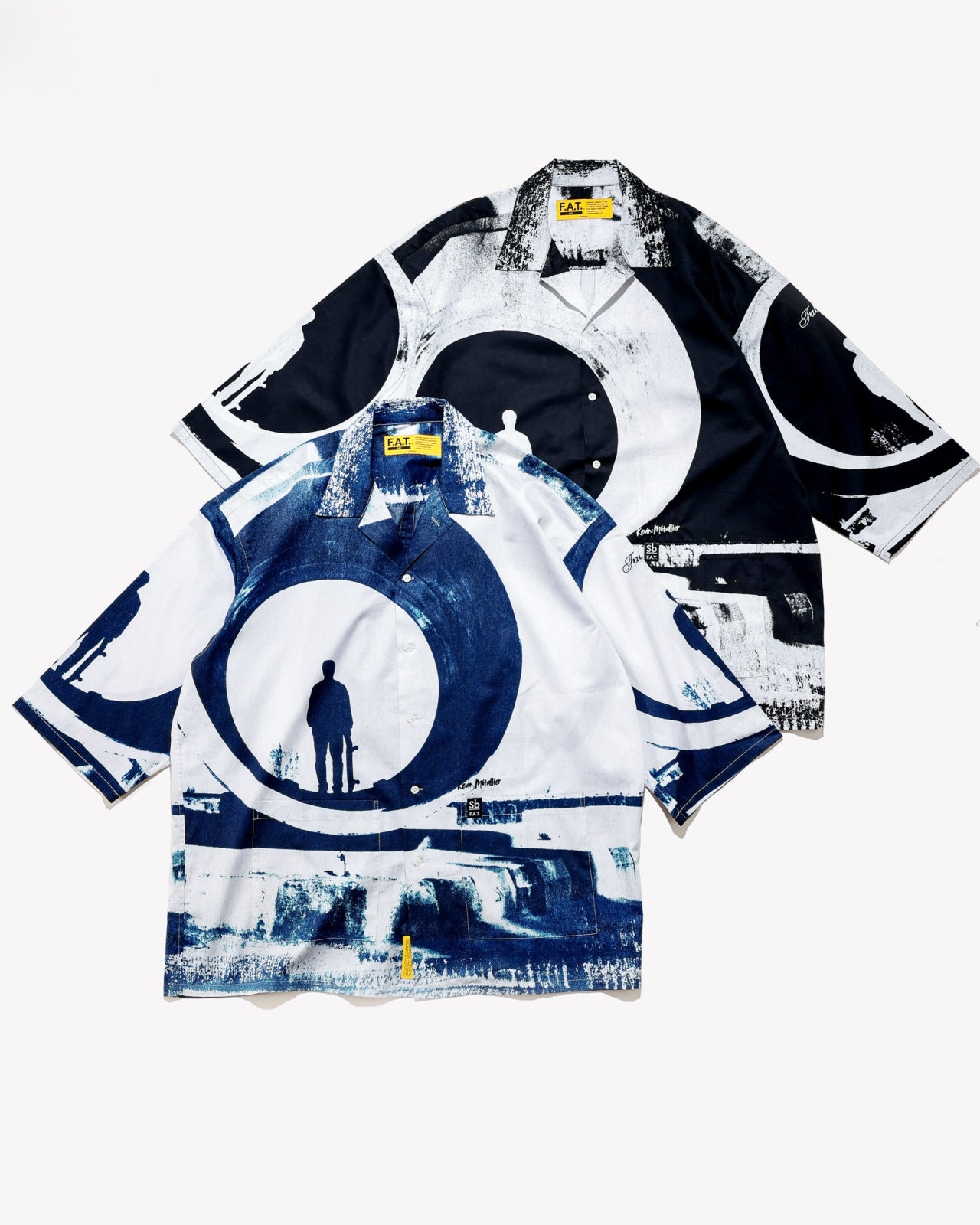 サイアノタイプな青写真を全面プリントした8分袖シャツ。これは、イランのヤズドに向かう途中にあったスケートスポット、魅力的なフルパイプの写真。本家の青写真とともにブラックバージョンも展開。「そしたら、青写真じゃないじゃん」というツッコミは百も承知で、こちらはケビンの写真の絵的な部分と質感にフォーカスしたF.A.T.による、シックに仕上げたいF.A.T.ユーザーのためのバージョン。