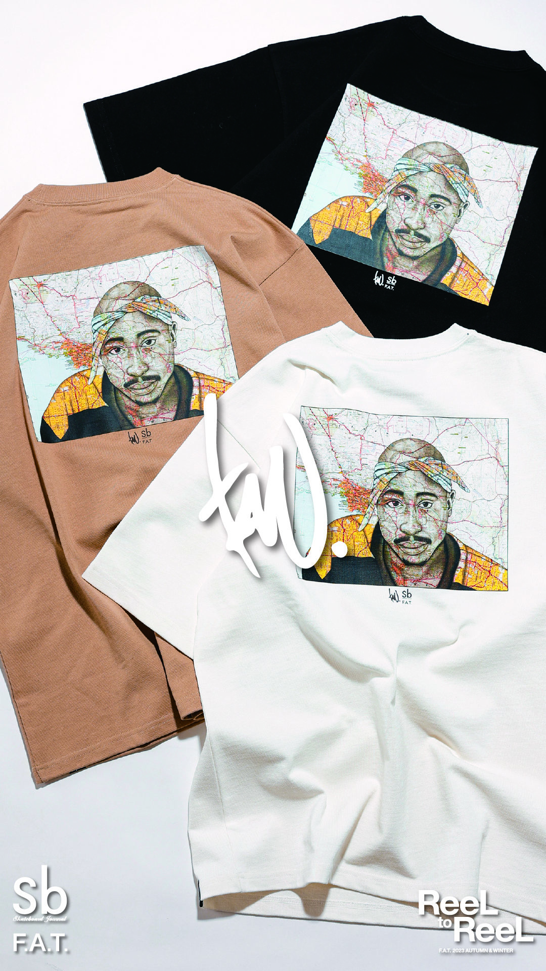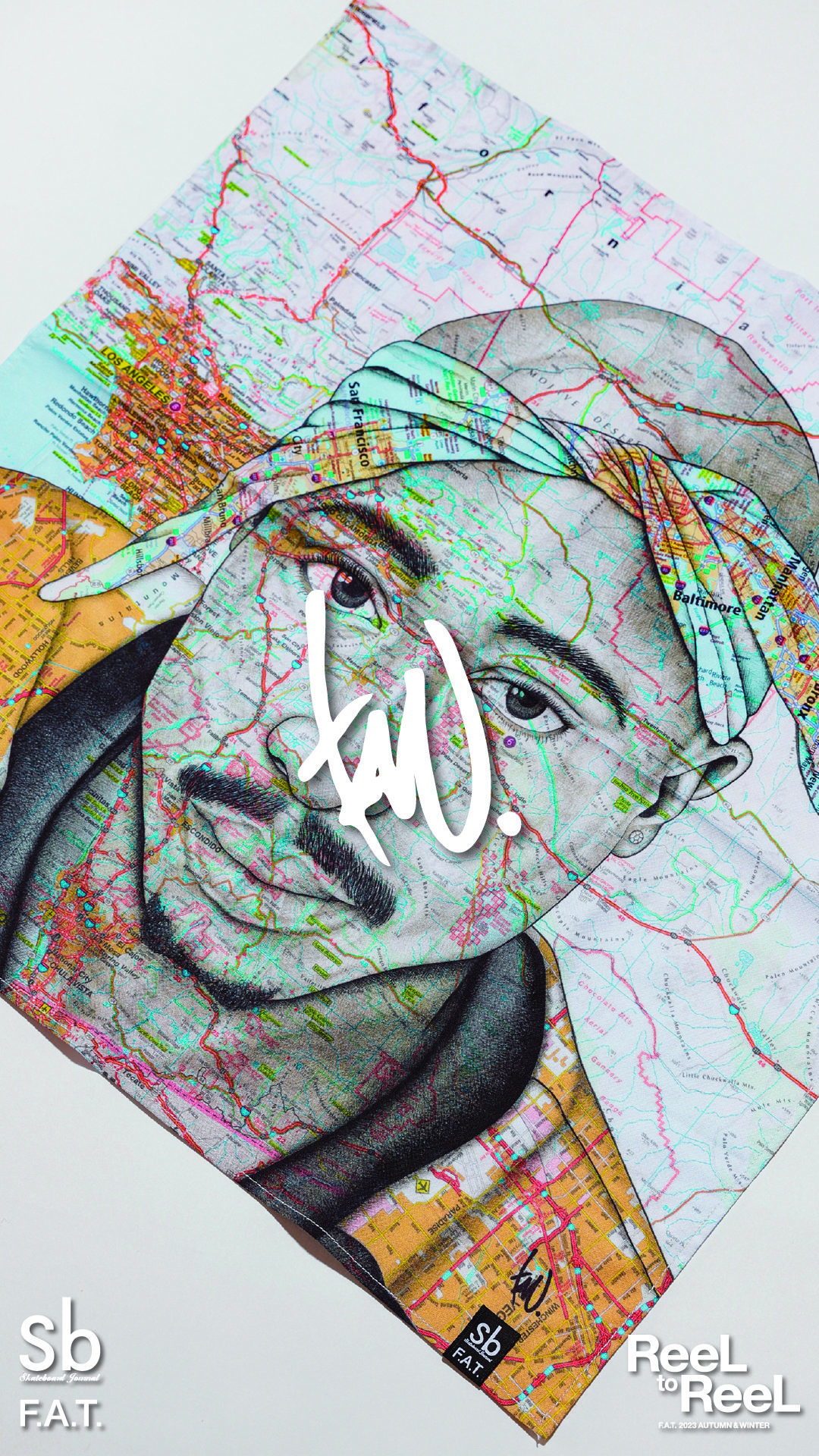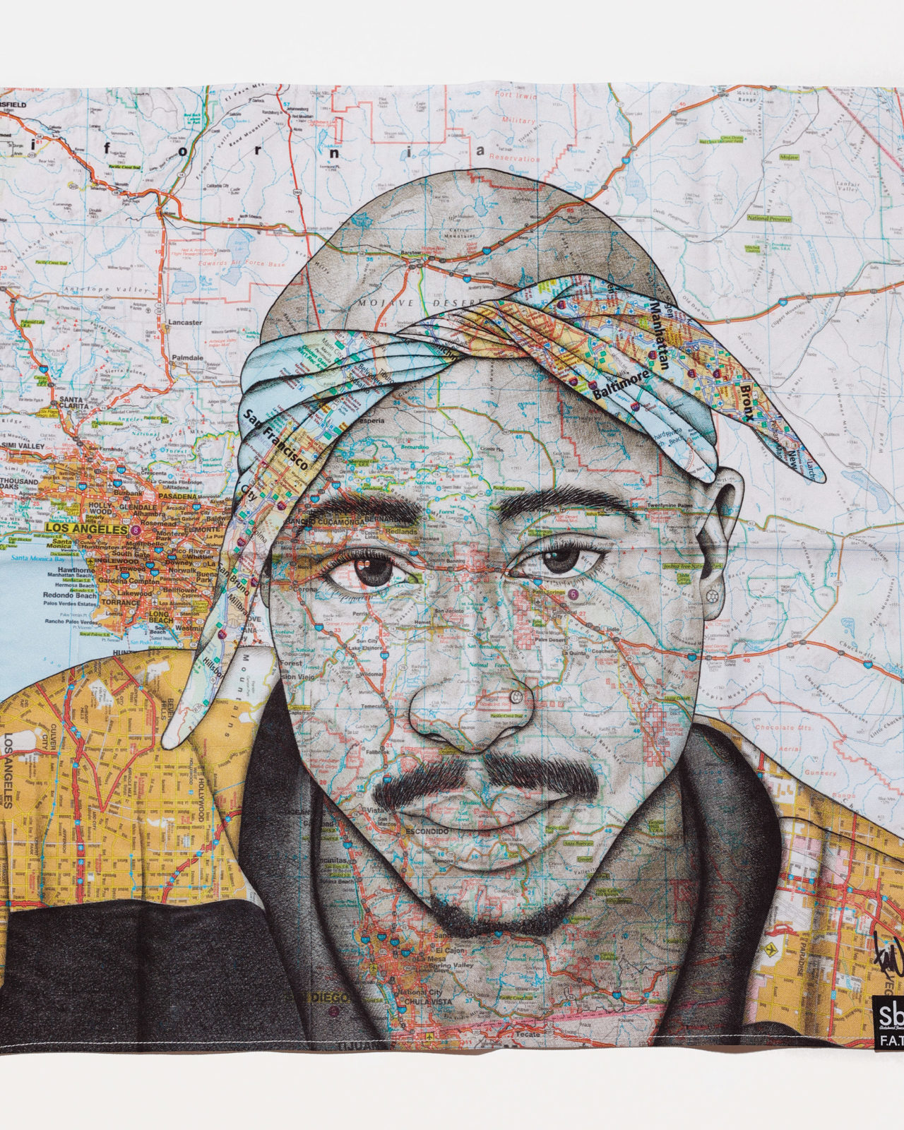 定番の13oz Tシャツにあって、F.A.T.13オンス・ギャラリーのレギュラー・アーティストではないかと思われるほど、ほぼ毎回素晴らしい描き下ろし作品を提供してくれるTAVU。被写体とその所縁の地図。これは彼のスタイルであり、それは時にポリティカルなやつ、ヒストリックやメモリアルなやつ、さらにはオマージュなやつが描かれる。今回は、政治的メッセージも追悼の念もすべてを含んだ、常に耳と心にリリックが残るアイコン、2パックが描かれている。
