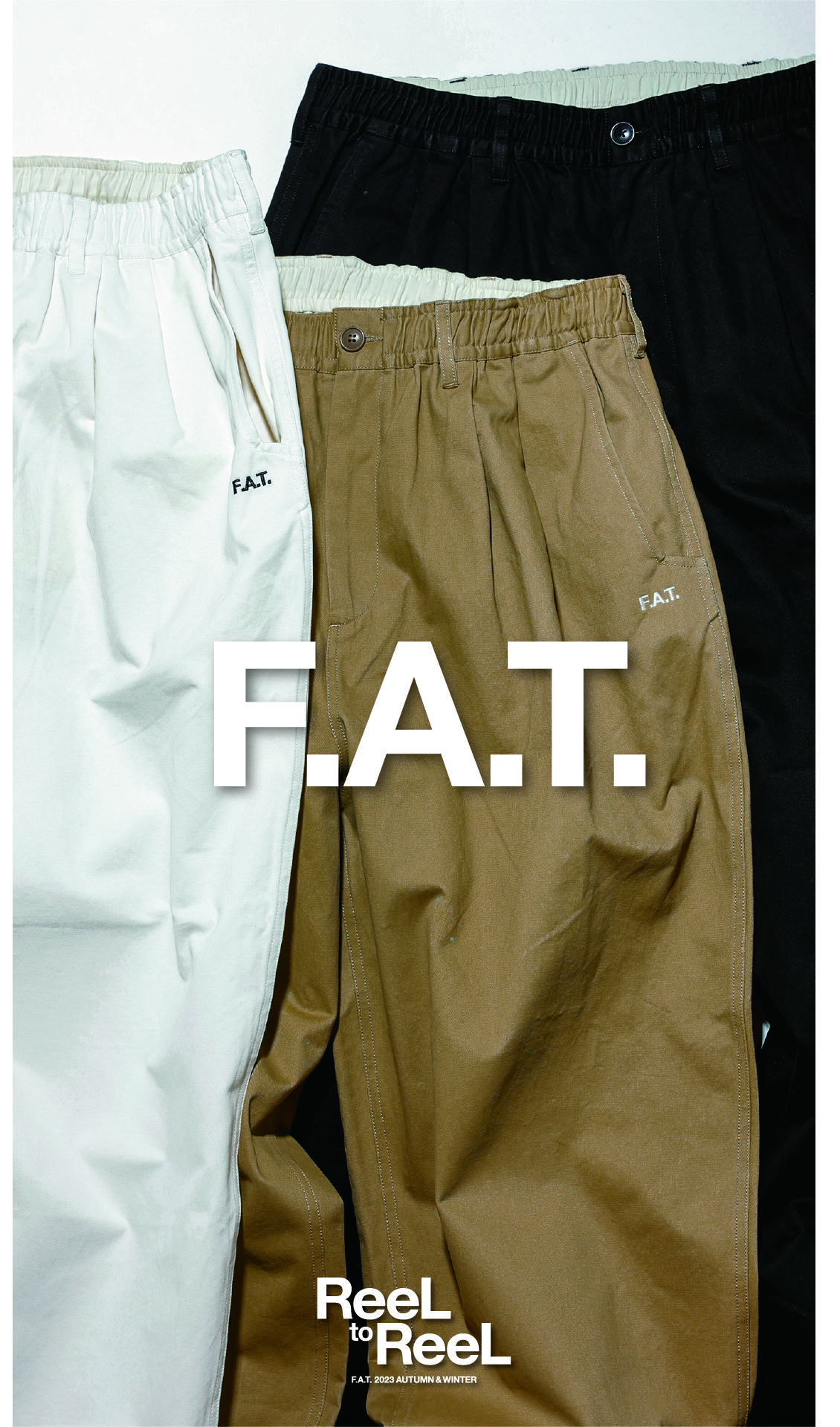今季もデザインをアップデートし、これまでよりも生地の肉感が増したコットンツイル生地や、ウエストはゴムを入れたイージー仕様、さらに左ポケット口にはF.A.T.刺繍を加え、これまでとはまた違った仕上がり。