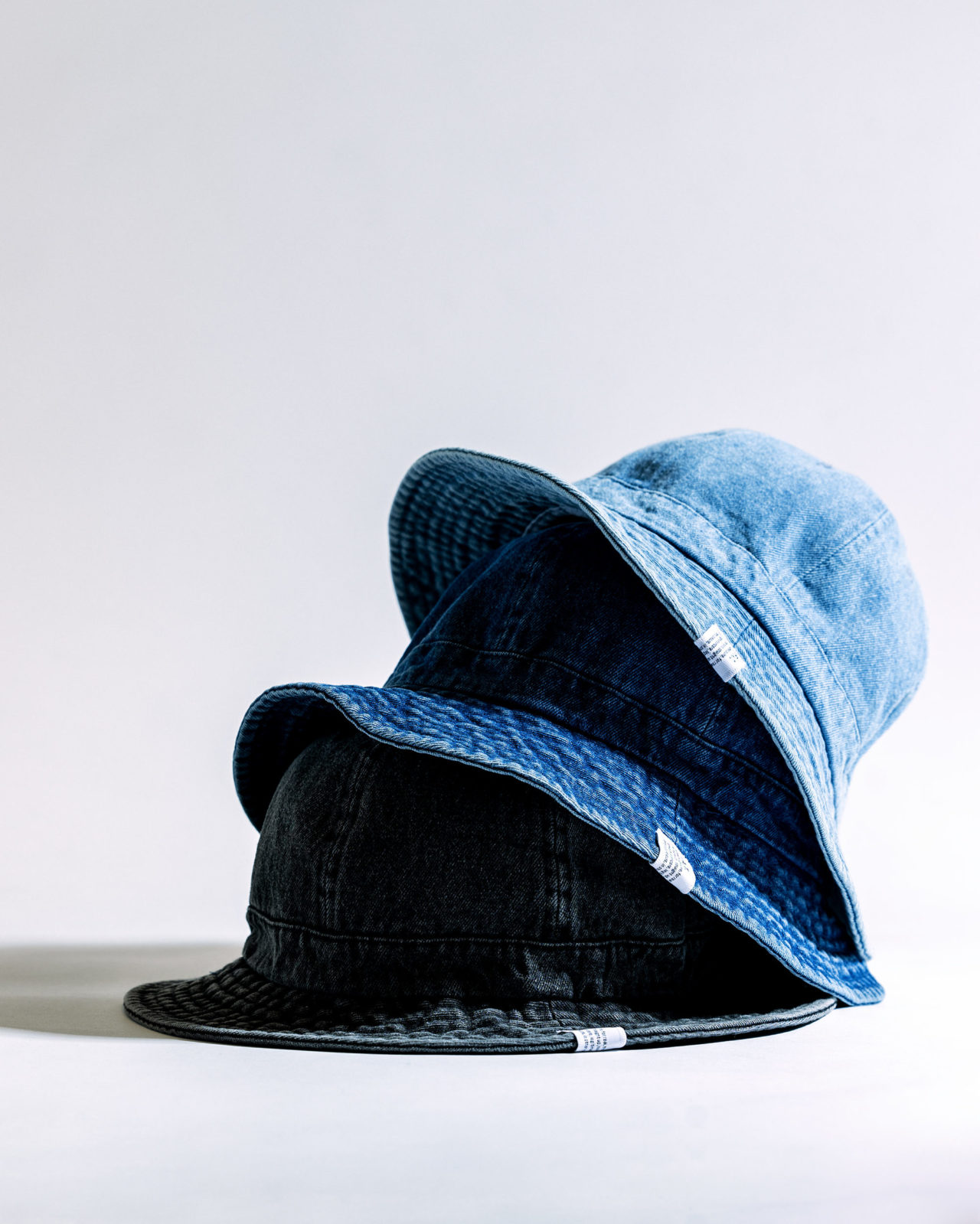 定番になっているバケットハットはブリムにブランドネームのみのシンプルなデザイン。こちらはコットンツイル生地にピグメント加工を加え、小慣れた表情が特徴。スタイリングのアクセントにするか、統一感を出す合わせにするか、いずれにせよ余計にはなりすぎない。スタイルを選ばず被れるというのも魅力で、これらのカラーバリエーションから一つ、二つと選んでみてください。