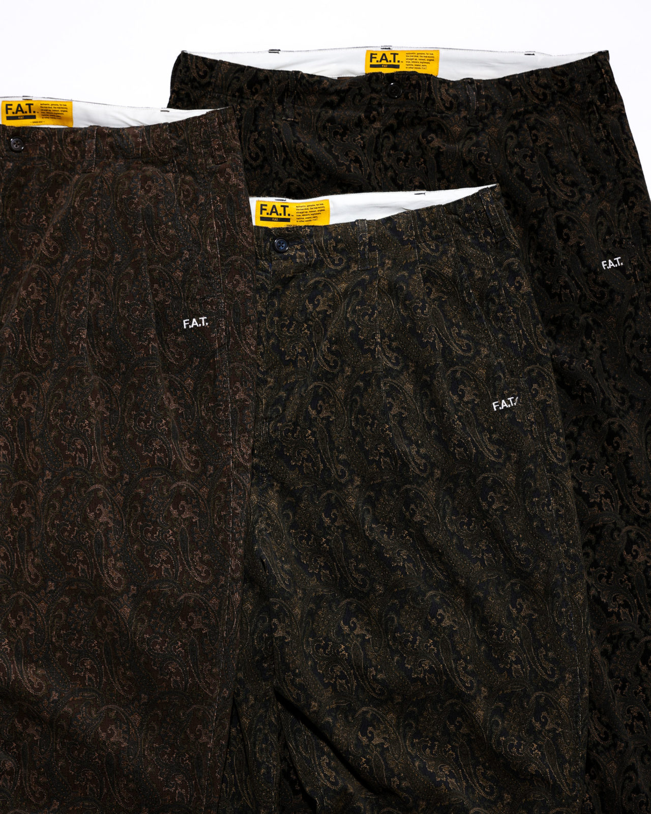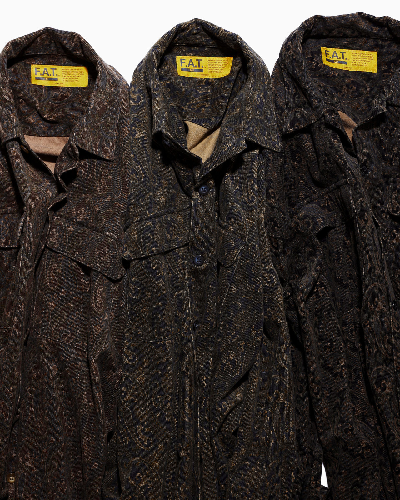 こちらはペイズリープリントを施した細畝コーデュロイのセットアップ。シャツは通常よりも身幅、肩幅にゆとりを持たせたビッグシルエットの作り、パンツはバギーシルエットにあたる”ELEPHANT”型の作り、どちらもF.A.T.独自のオリジナルシルエットで仕立てています。季節を感じる素材に柄、こだわったカラーバリエーションで展開です。ぜひ!!!