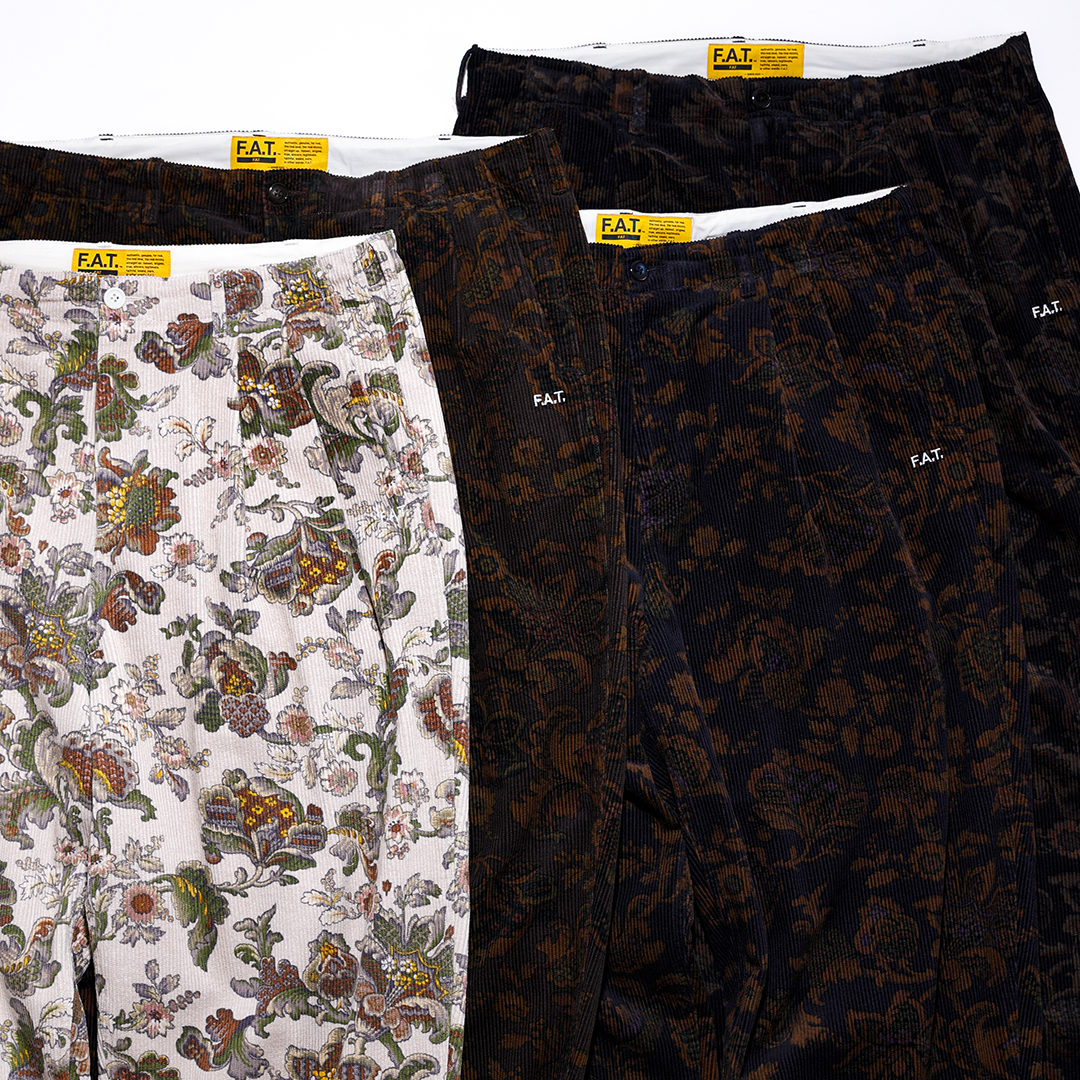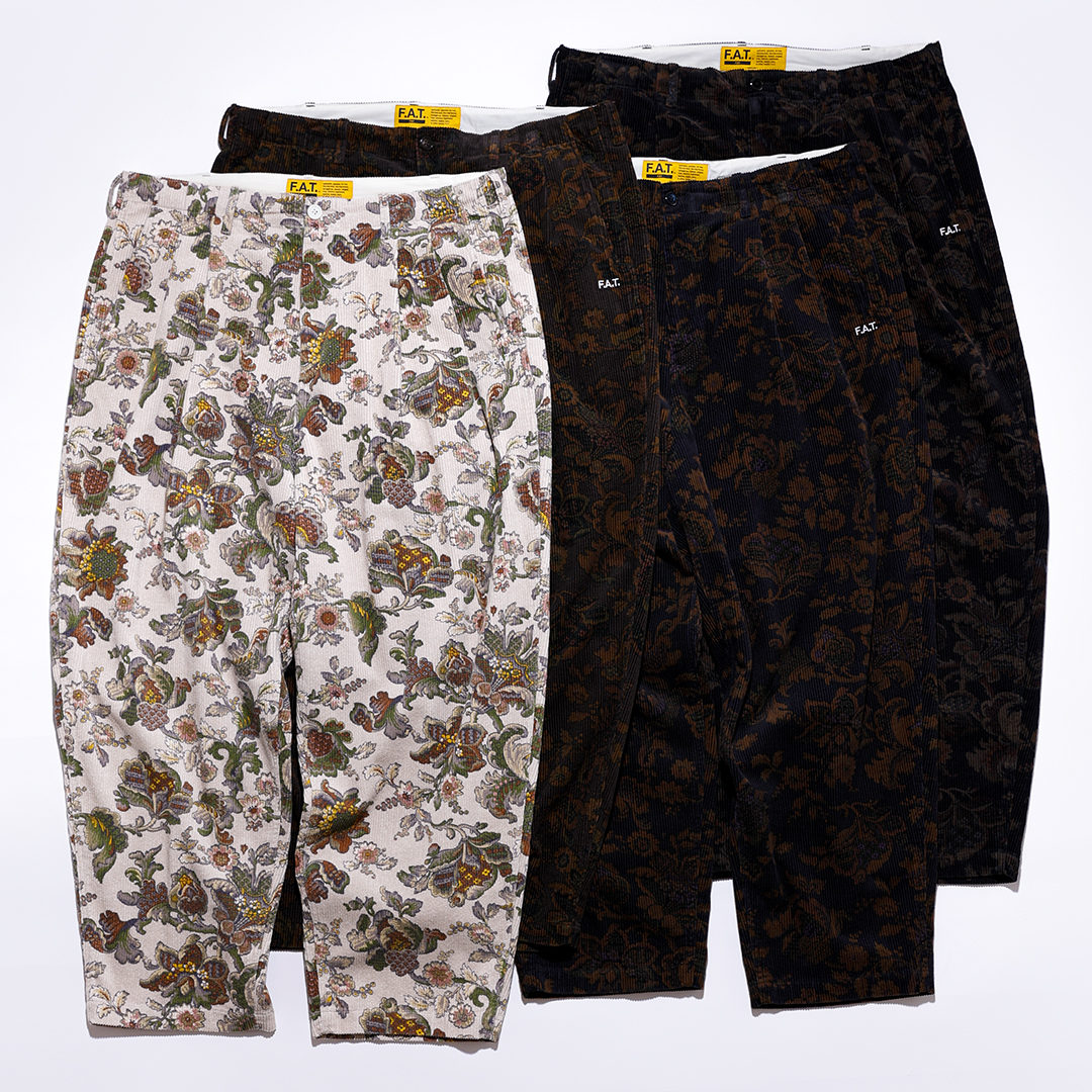 F.A.T.独自のオリジナルシルエットは2タックを入れ、わたり幅(もも)に大胆なボリューム、裾にかけてややテーパードさせ、長くなり過ぎないレングスに整えたデザイン。多岐にわたるスニーカーやシューズとの相性も良く汎用性も高いアイテムです。ぜひ!!!