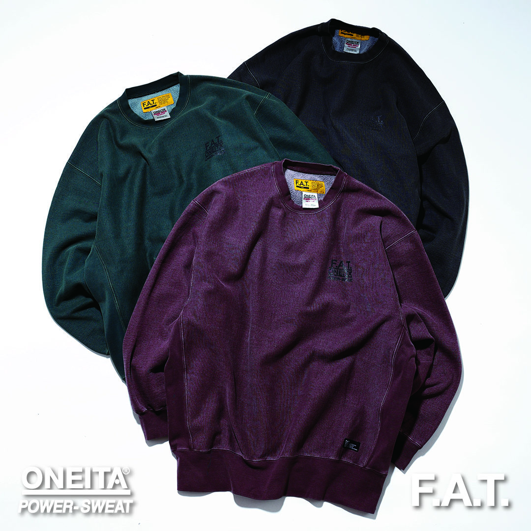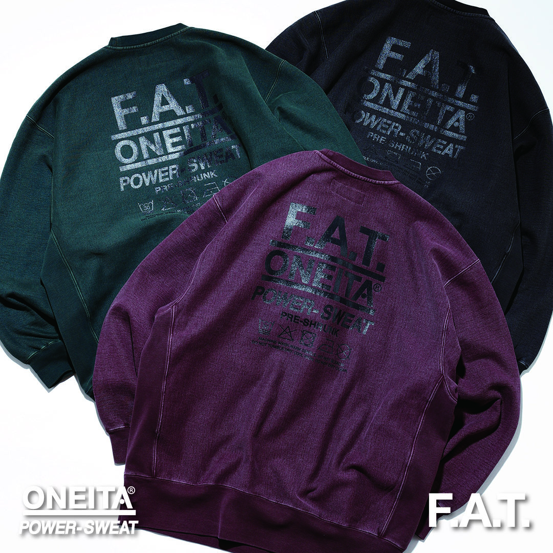 ONEITA x F.A.T.のコラボレーションスウェット。1893年からアメリカでアンダーウェアのブランドとして始まり、Tシャツやスウェットシャツまで展開するブランド。裏毛素材の”POWER-SWEAT”を使用し、ピグメント加工を施した、こちらはクルーネックスウェット。独特なムラ感と、15オンスの厚みを持ちながら着心地が良い柔らかさも兼ね備えています。さらに胸と背中には大胆に光沢感のあるラバープリントを施した仕上がり。