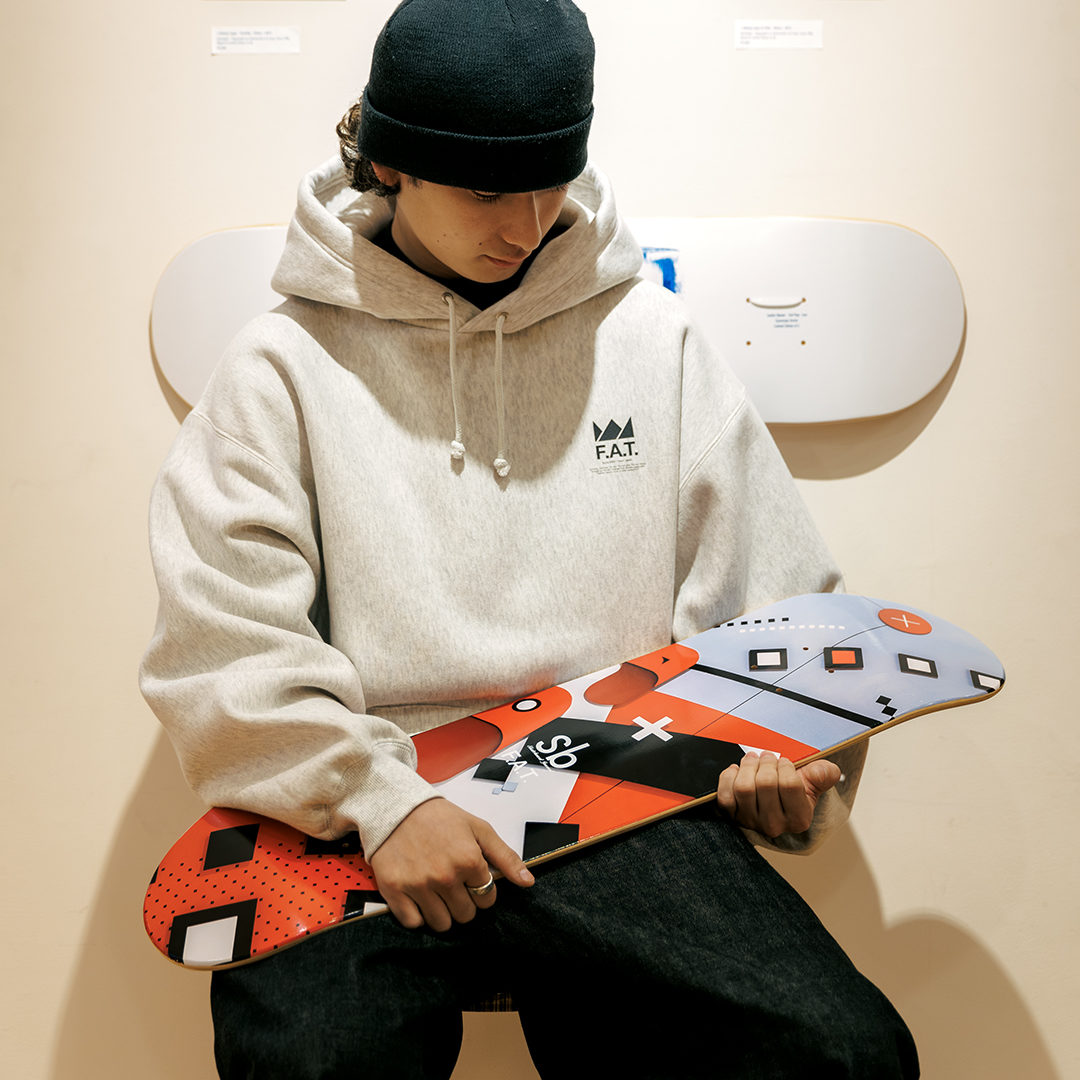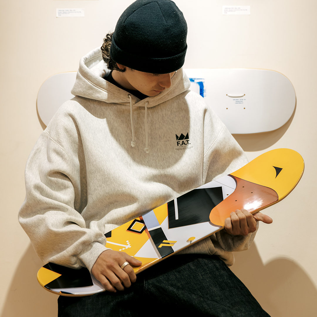 アーティストFATE、その名のスタートは1994年。ストリートアートに触発されグラフィティを描きはじめたところに遡る。高いスキル、繊細なスキル。それらをもとにして描かれたレタリングが評価され、国内外にその名を響かせている。ストリートの最前線で培ってきたグラフィティのスタイルと、推敲されたミリ単位のデザインを掛け合わせた「文字・物・事」を独自の解釈で幾何学的かつ多角的に表現しているアーティスト。そんな彼がF.A.T.のヘッドラインのために完全描き下ろし。今回はそのオリジナル作品をふんだんにアイテムへと完全投影させたラインナップ。2カラーバージョンで展開。