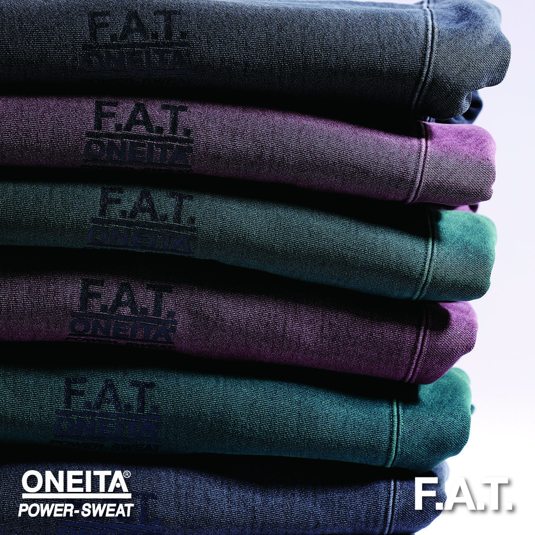 ONEITA x F.A.T.のコラボレーションスウェット。1893年からアメリカでアンダーウェアのブランドとして始まり、Tシャツやスウェットシャツまで展開するブランド。裏毛素材の”POWER-SWEAT”を使用し、ピグメント加工を施した、こちらはクルーネックスウェット。独特なムラ感と、15オンスの厚みを持ちながら着心地が良い柔らかさも兼ね備えています。さらに胸と背中には大胆に光沢感のあるラバープリントを施した仕上がり。