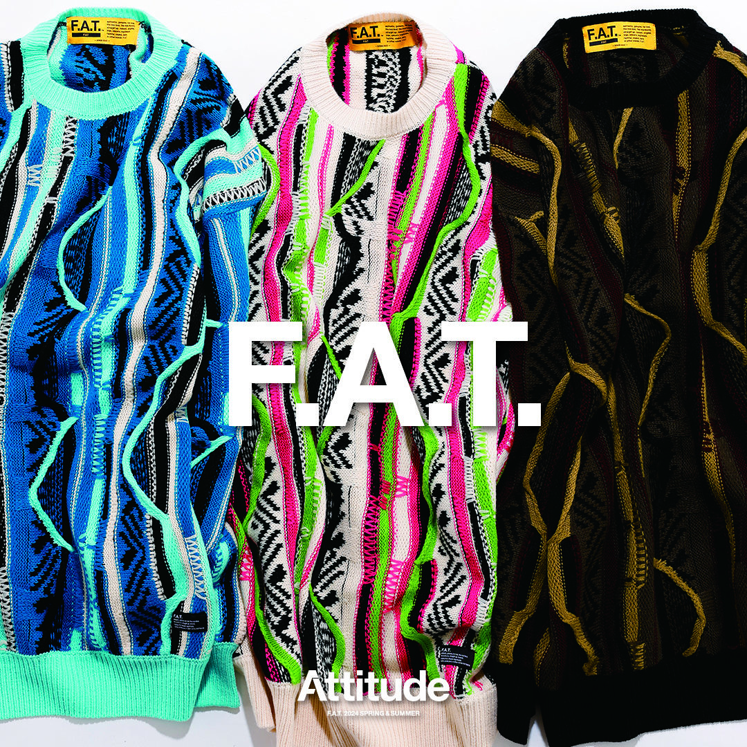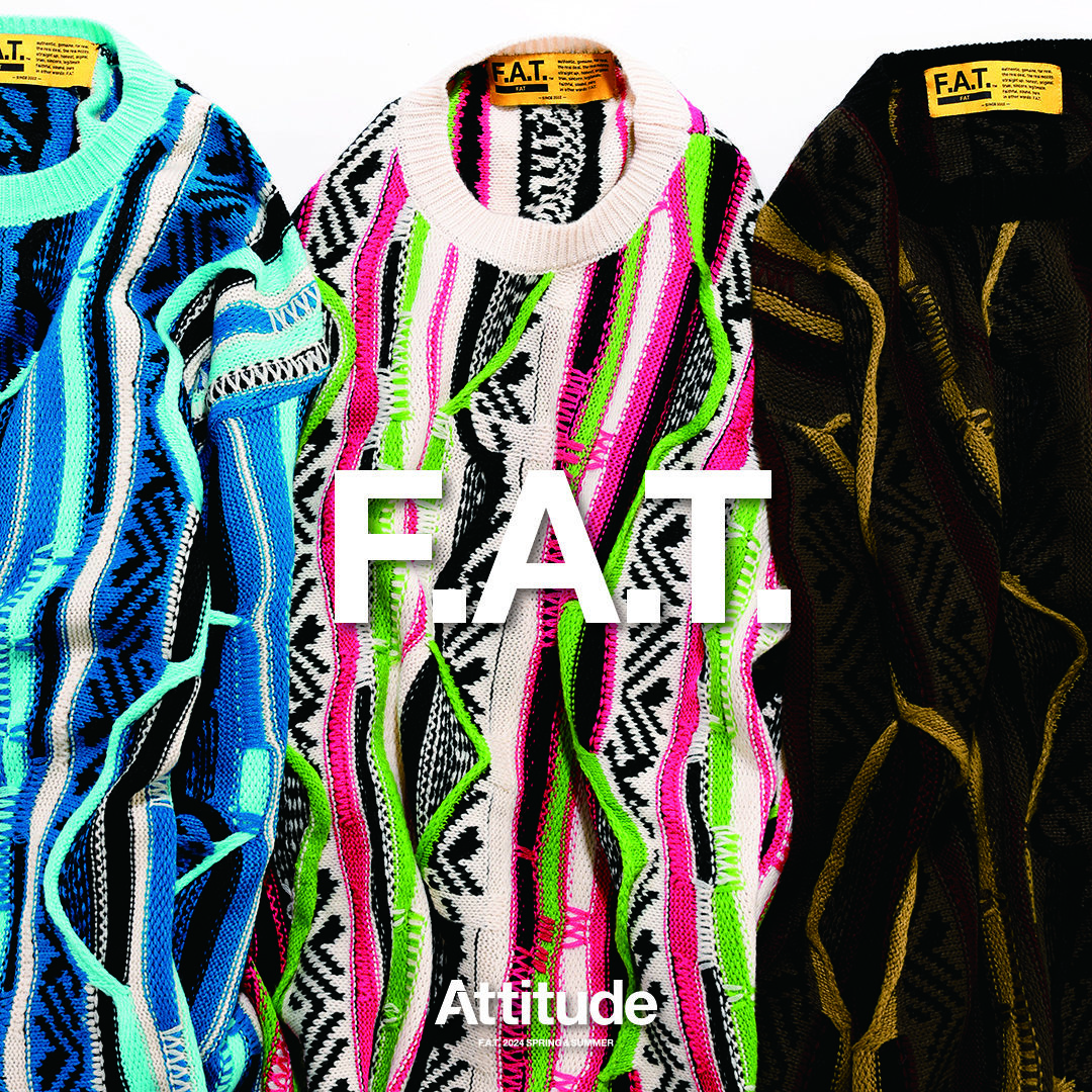 複雑な編み方と絶妙なカラーヤーンの組み合わせが印象的な立体構造のニットシリーズ。いわゆる3Dニットと呼ばれるアイテムは、90’sのHip Hopアーティストが思い浮かぶパターン(柄)をF.A.T.らしいビッグシルエットとカラーリングで仕立て、アイテム単体でもスタイリングのメインが張れる。また、同素材のニット同士でクルーネック+カーディガンのアンサンブルな着こなしもオススメ。お試しください、ぜひ!!!