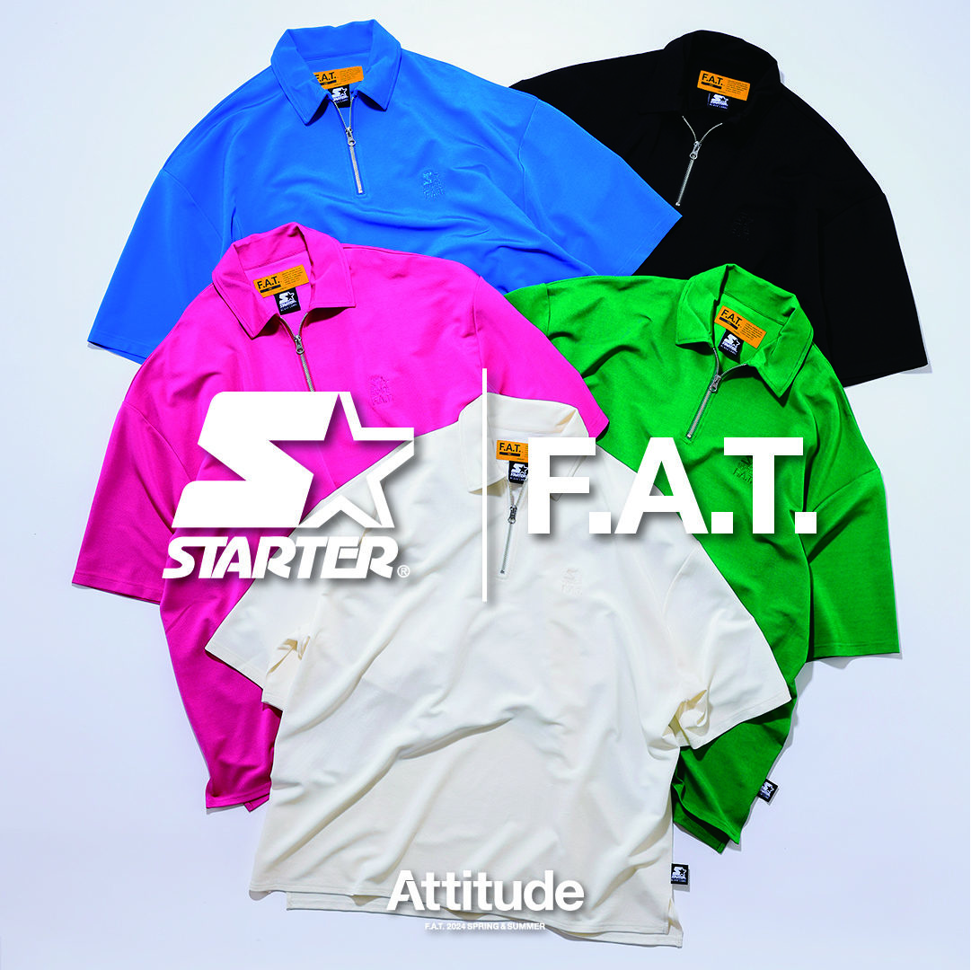 STARTERとのコラボレーションではホッケーシャツ、ポケTee、ハーフジップポロ、イージーショーツの4型をそれぞれ5色で展開。あえてソリッドなデザインにした両ブランドのロゴ刺繍やF.A.T.らしいビッグシルエットに仕上げたアイテムをご覧ください!!! ぜひ!!!