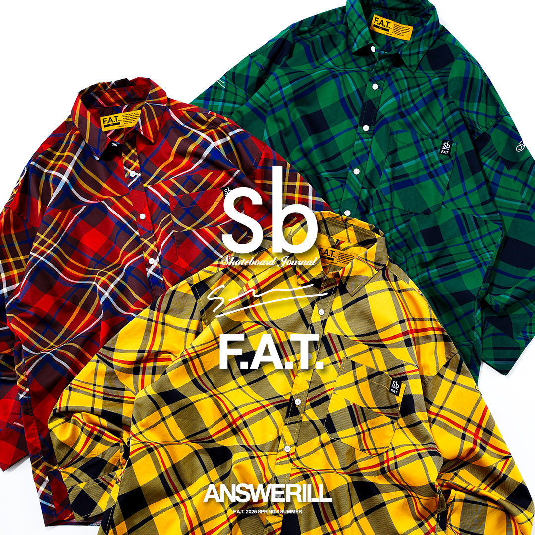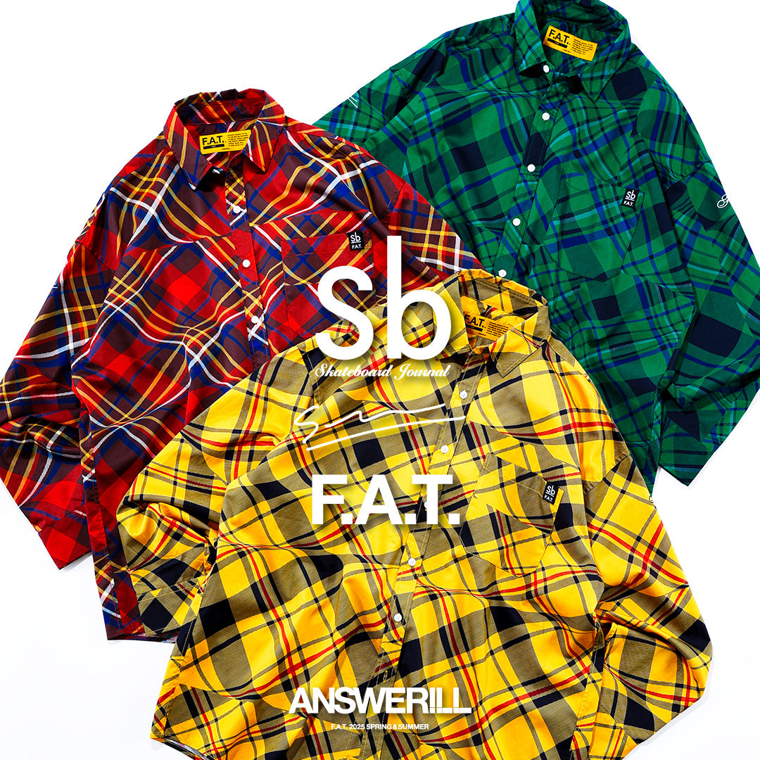 デカボタン野郎Aチームに、オーバーサイズなプランBに、サイアノタイプの総柄Cクラスなどなど、F.A.T.ならではの規格と企画の楽しいシャツのラインナップ。そこにやってきたアップカマーでいきなりシーズンMVP候補の”ゆれるタータン”から織り成されたシャツ。世界中のありとあらゆるブランドが放つ定番中の定番チェックシャツにあって、どの街角で振り返ってもF.A.T.でしかないチェックシャツになりました。画家・今井俊介の描き下ろしによる”ゆれるタータン”がそれを決定的にしてくれたのです。