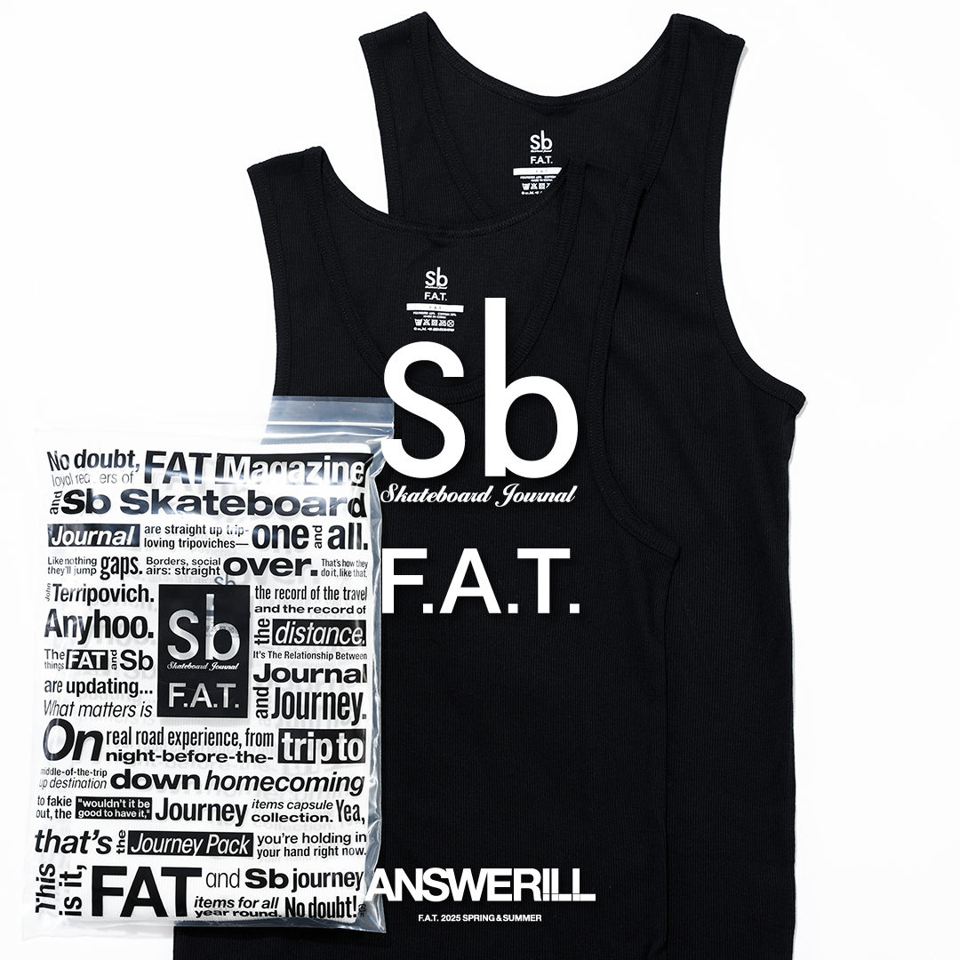 “JOURNEY PACK”シリーズのパック・タンクトップ。旅先のインナーとしてフル活用のニクイヤツ。もちろん、これ1枚でピックアップゲームにジョインしたり、スケボーしたり、ジョグしたりしてもいい。なんだって使い勝手がいい。何枚持っててもいい、無駄なことなんてない、相棒的な存在。ド定番のホワイトとブラックを、F.A.T.はひたすらキープオン・プッシング!