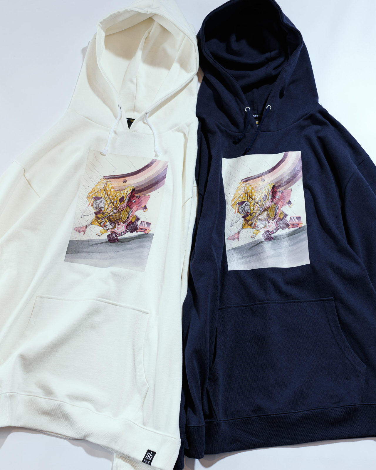 しっかりとした13ozのキャンバス。35のネガフィルのベタ焼きを彷彿させるフロントプリント。ストリート最前線に繰り出すアイテムを作るのに、どこかノスタルジアでアナログな雰囲気を漂わすのが、F.A.T.が仕掛けるアーティストとSbとのコラボシリーズ。個人的には、ネイビーの13ozボデイにプリントされたこの絵が、今回のヘッドラインの筆頭株主な気がする。