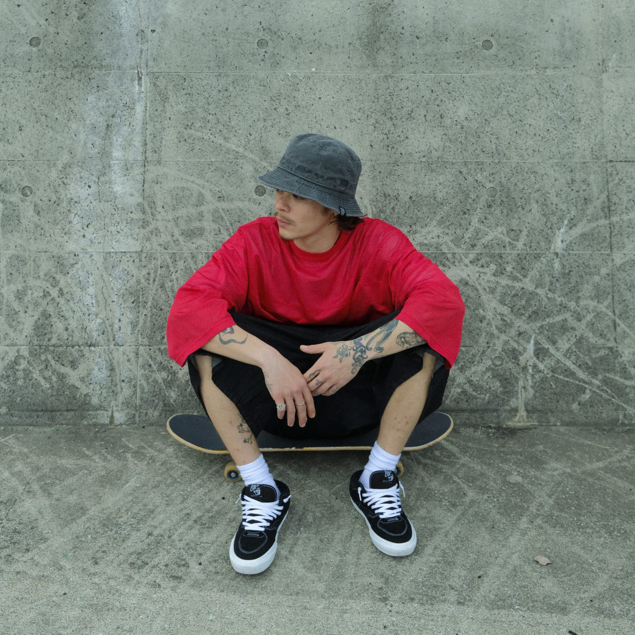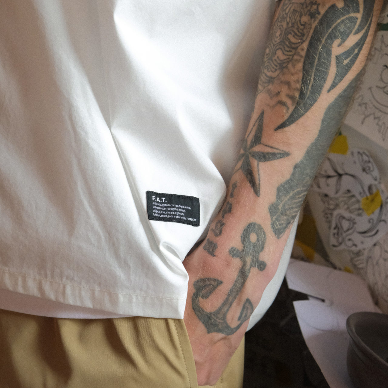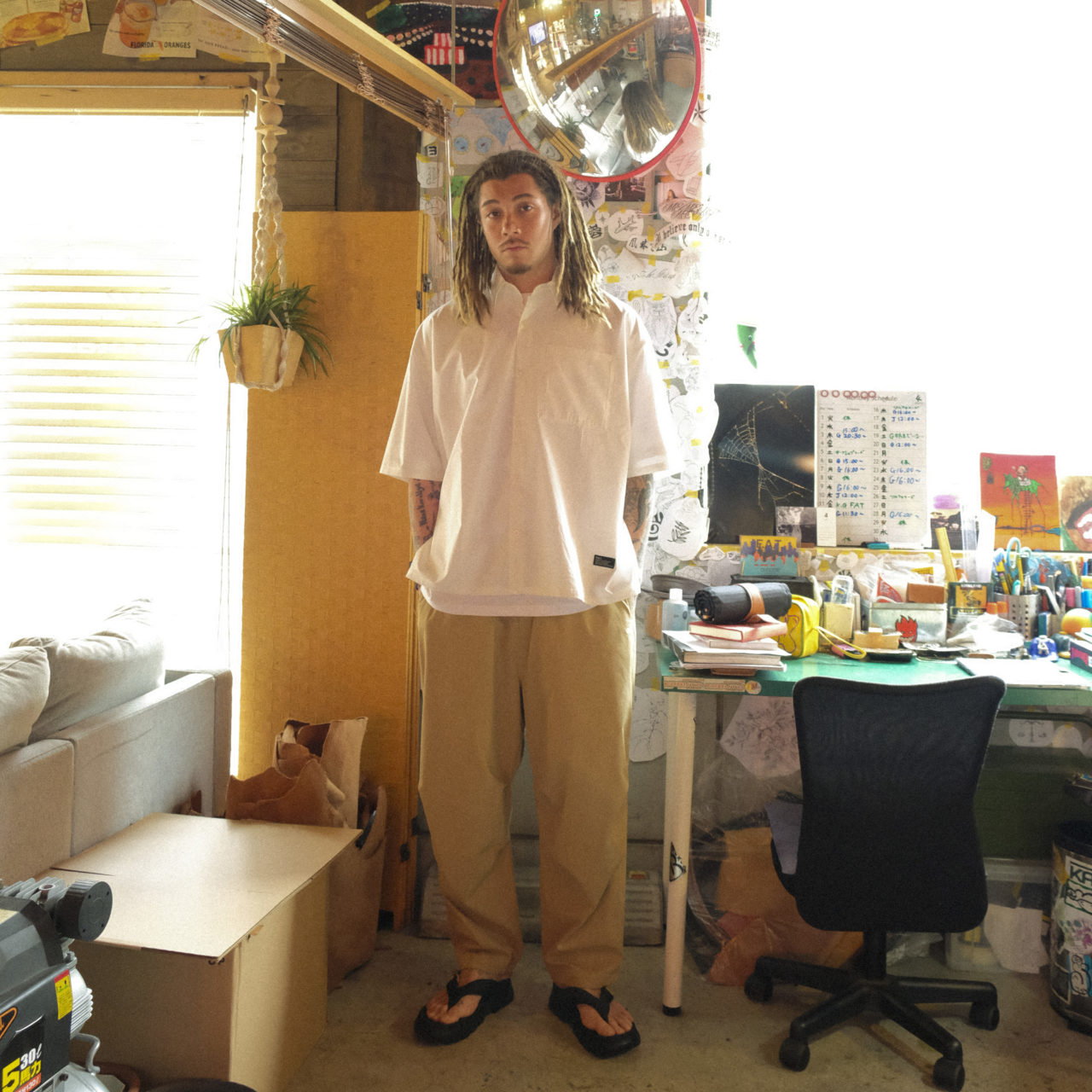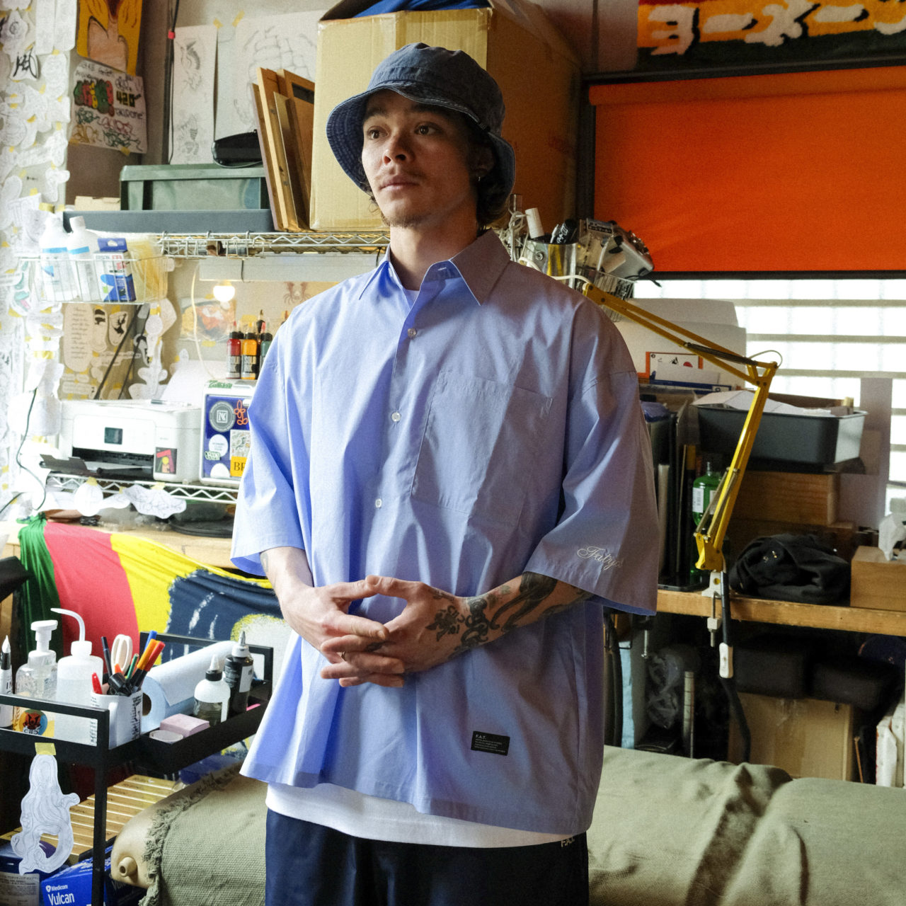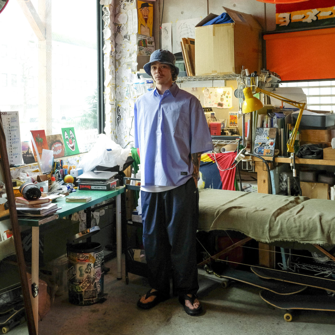 肌触りの良いウールライクな質感が魅力のトロピカルクロスを使用したセットアップは、ワークテイストを感じさせる左右非対称ポケットのハーフジッププルオーバーシャツと、F.A.T.らしいワイドテーパードパンツのコンビネーション。ゆったりとしたシルエットながらも野暮ったさを感じさせない洗練された仕上がりで、セットアップとしてはもちろん、それぞれ単体でも活躍する一着です。