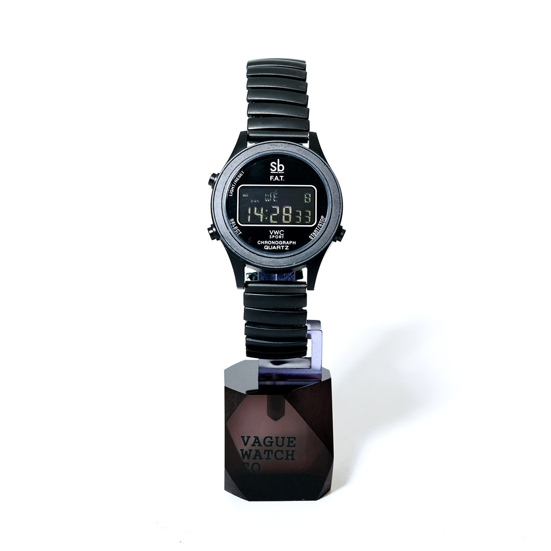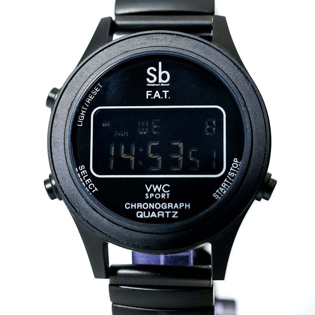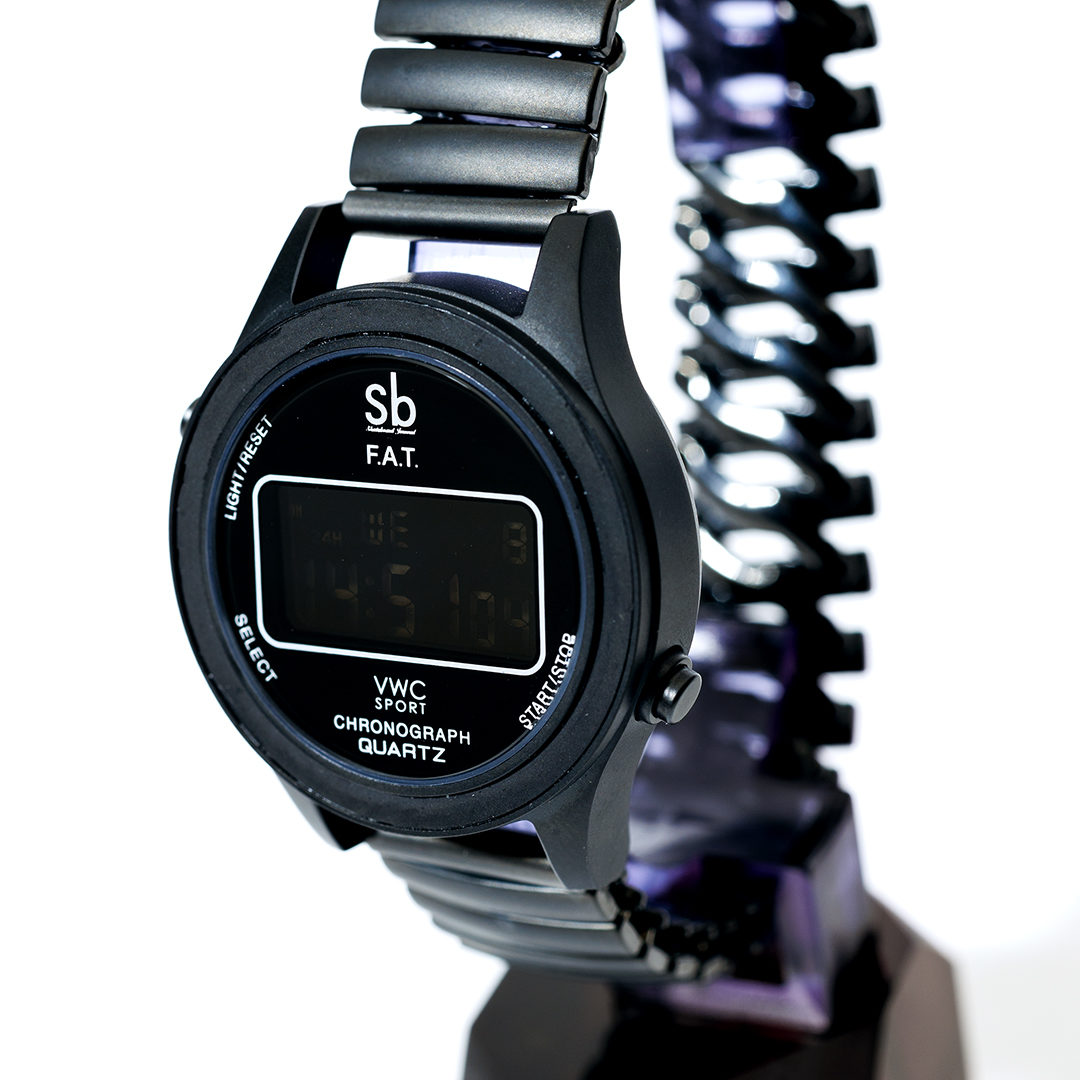 Sb × F.A.T.のコラボレーションウォッチは、デジタルフェイスにエクステンションベルト(コマの繋ぎ目がバネ式タイプ)のオールブラックデザイン。この組み合わせが絶妙に意外にないっていう、、、これがベストだとは思うけど、、、!デジタルウォッチではスクエアなものが多いので、ラウンドタイプでいて且つ小振りなサイズはありそうでいてない。