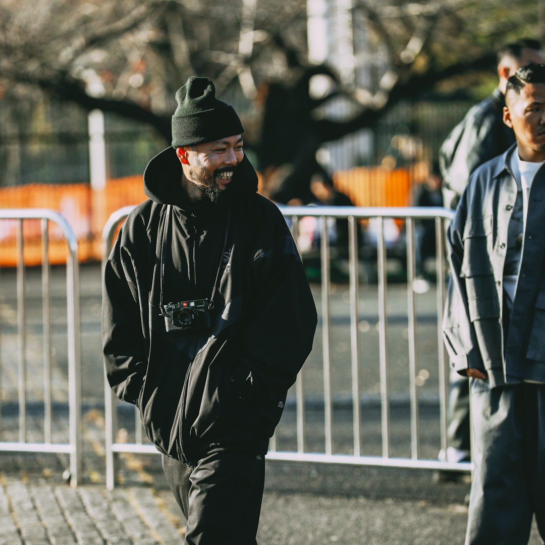 ALLDAY ALLNIGHT EVERYWHERE ANYWHEREでストリートボールの“ballaholic”と、いつでもどこでもデカくて黄色か黒くてストリートなF.A.T.と、スケボーをジャーナルし続けて20年のSbとの、どこでもどうしてでも対応してくれるジャージーのようなジャージーではない洒落たセットアップ。裏ネタ的には、御大クリント・イーストウッド監督の息子でイカした俳優のスコット・イーストウッドが、映画『アウト・ポスト』なんかで着ている、屈強な男たちのトレーニングウエアがモチーフ。