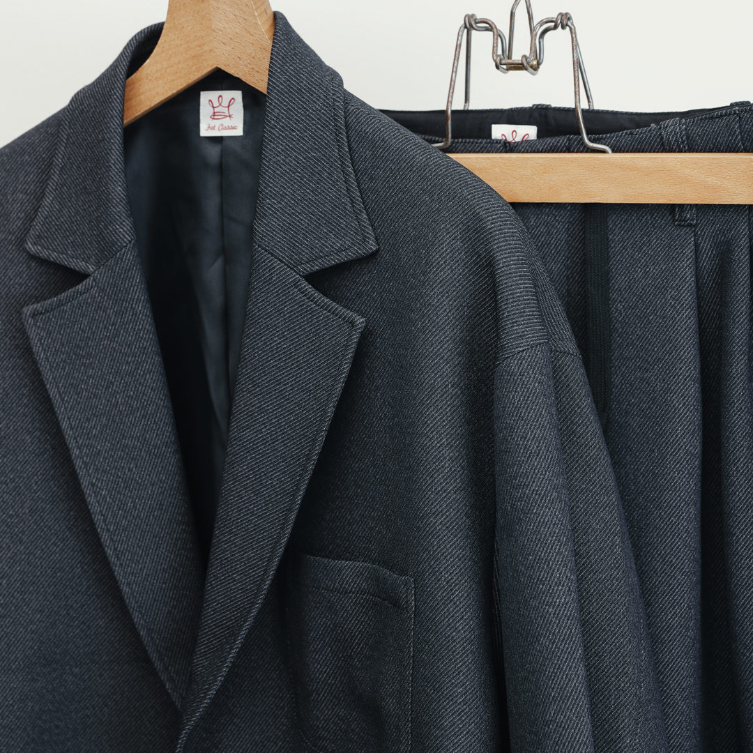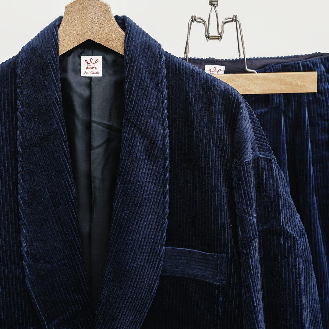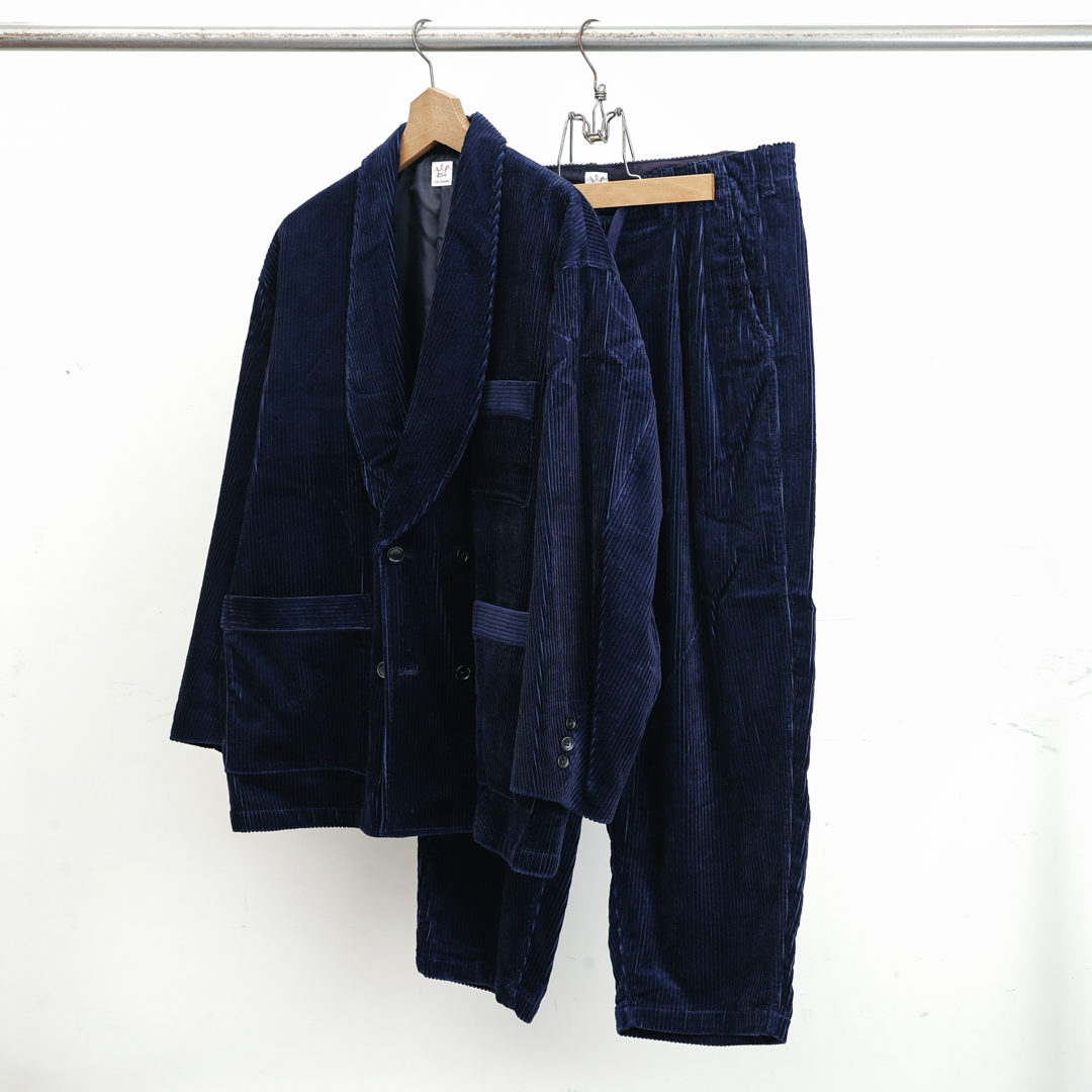 適度な肉感が印象的なコーデュロイ素材を使用したセットアップ。スモーキングジャケットをベースとしたトップスは、シンプルながらもショールカラーとダブルブレスト仕立てがアクセントとなり、肩・身幅・アームまわりにゆとりをもたせたリラックスシルエット。パンツも股上を深くし、渡りを広くとることによりヒップから膝にかけてボリュームを持たせたワイドテーパードシルエット。