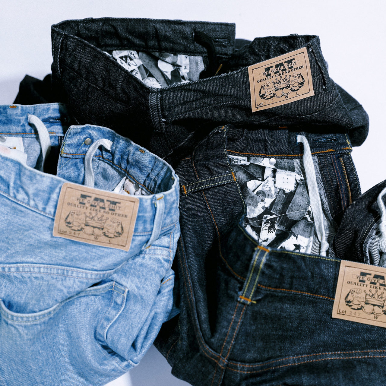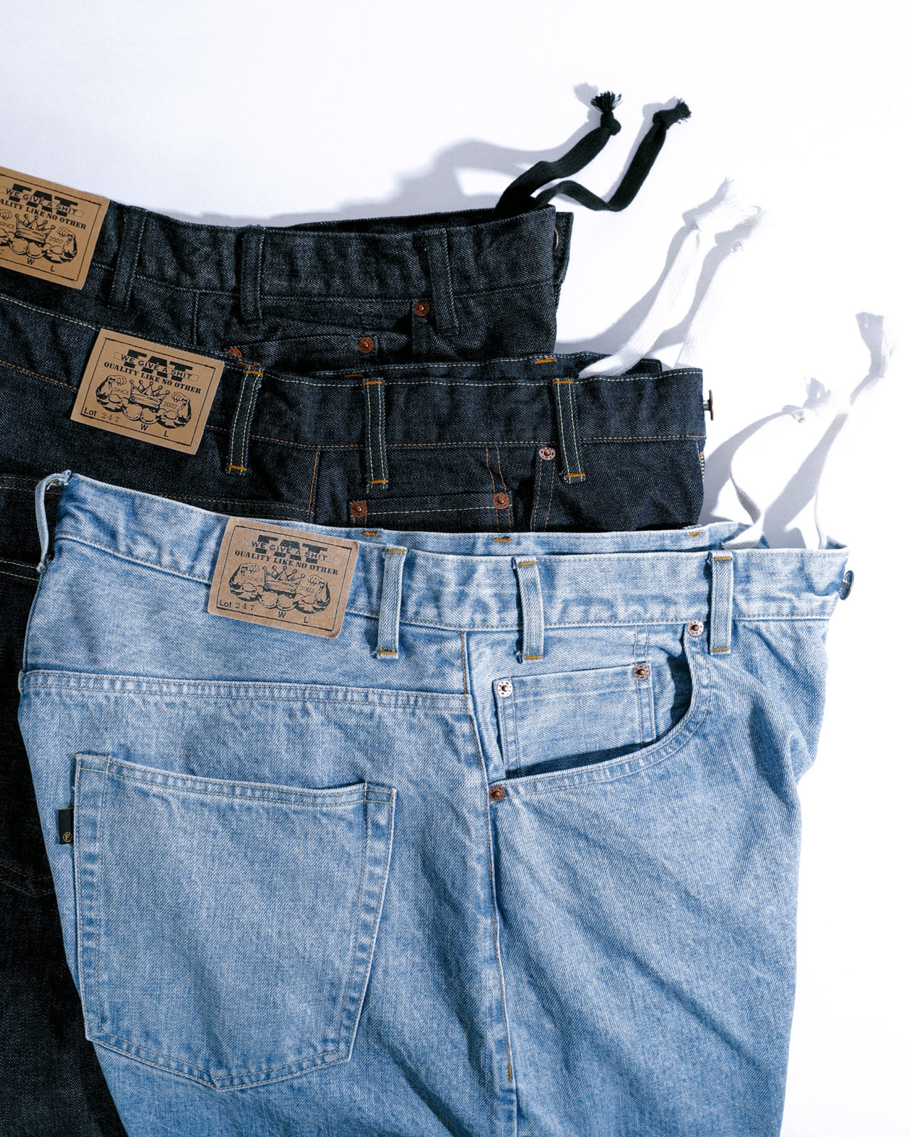 247は米英語で、1日の24時間と一週間の7日間を足し「Always = 毎日」毎日穿きたいデニムをコンセプトに”247″をデザイン。それがFAT定番の、FATといえばのデニム”247”がデリバリー。国産セルヴィッジデニム生地の定番色、BLUEに加え、新色のBLACKはBLUE同様にタテ糸、ヨコ糸を変え織りあげた生地。白のヨコ糸が入ることで、いわゆるデニムの色落ちが期待できる仕上がり。前回も反響の大きかった色落ち加工を加えた”FADER”も同じくスタンバイ。今回より改良した点は、ウエストにはドローコードを配したベルトレススタイル。絞って穿くスタイル。ストレスなく思わずスマイル。そんな毎回気づけばなくなっているデニム。ごめんだけどもスタッフ激レコメン。ぜひ!