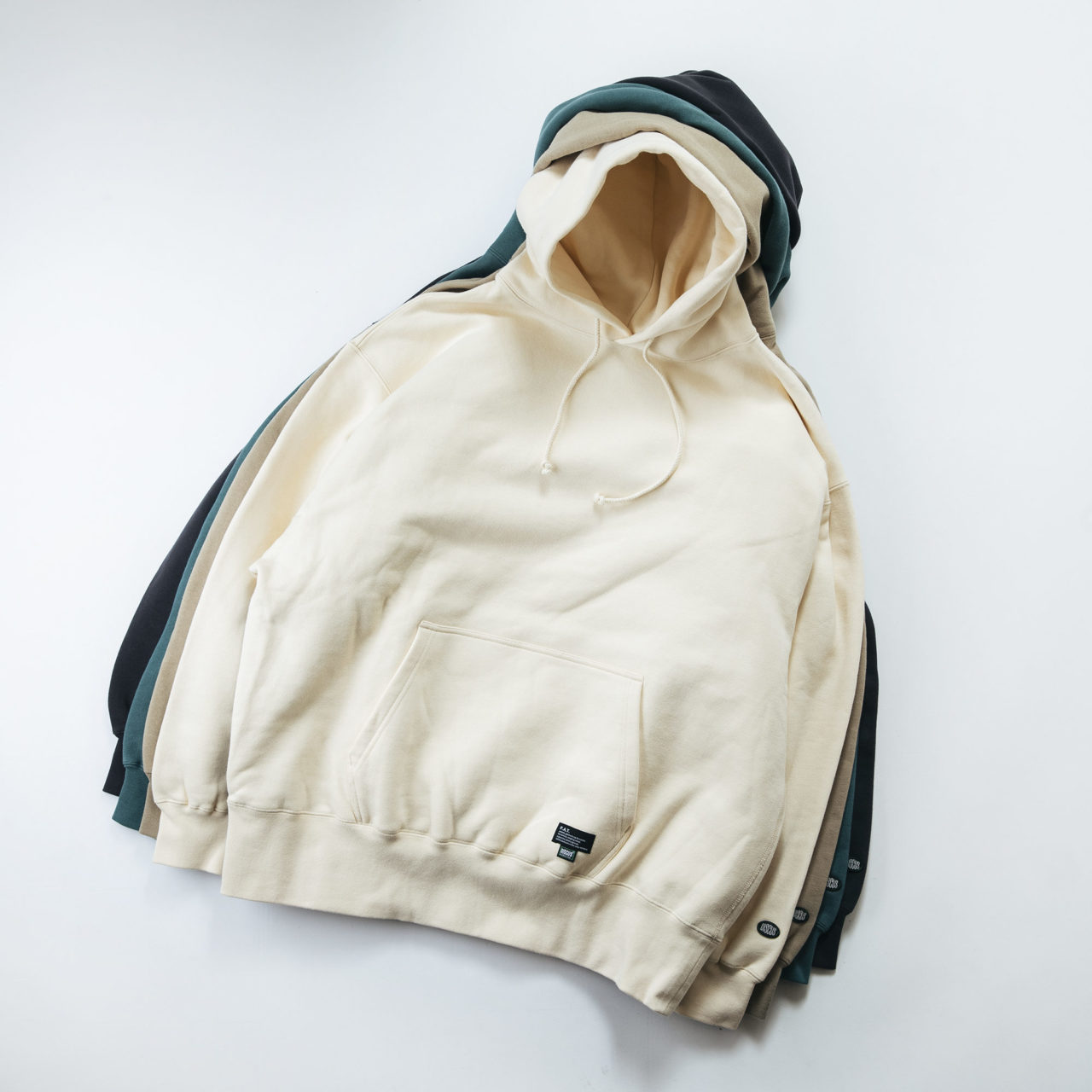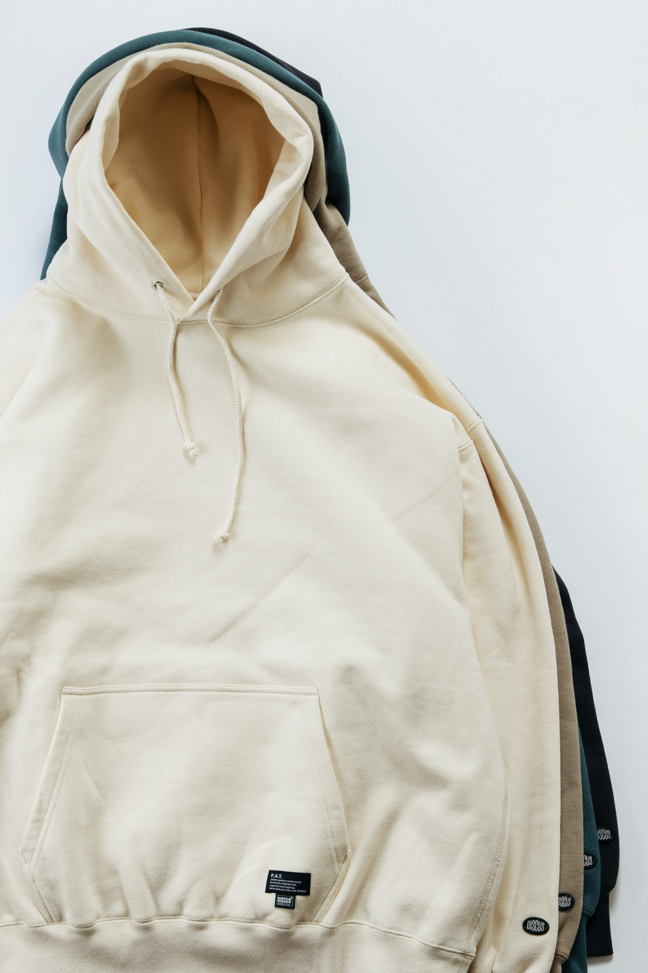 US COTTONから編み立てた14.2ozの裏起毛生地や袖下のガゼット切替え、フラットシーマー縫製と、オーセンティックなディテールを加えたスウェットパーカー。ここにFATのBIGシルエットで仕立てることでたっぷりとボリュームが出るのも特徴。