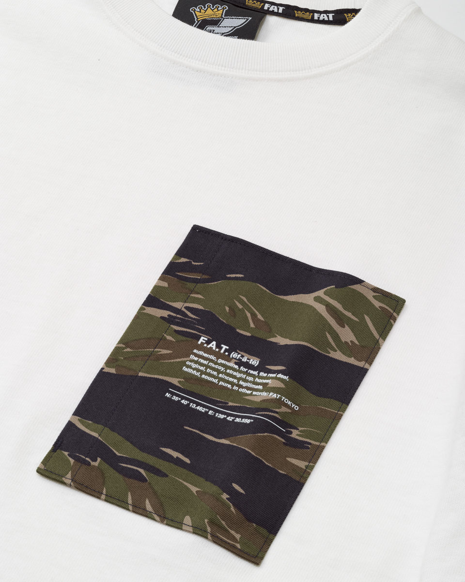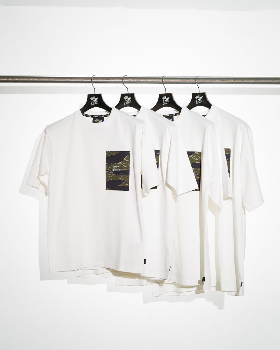 FATの代名詞でもあるヘビーオンスシリーズのポケットTシャツ。こちらはタイガーストライプ迷彩で切り替えたポケットをアクセントとした特別なアイテム。