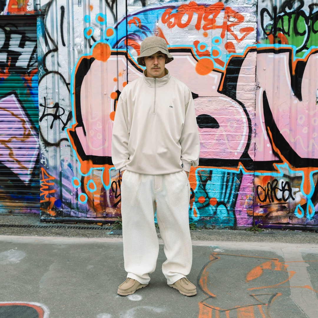 いわゆるジャージー素材を使用したハーフジップ。トップスもスウェットや13ozのTシャツ生地とも異なる厚みで、こちらも胸の小ぶりなブランドロゴ刺繍のソリッドデザインに仕上げ、スタイリングに取り入れやすい仕上がり。キレイめな佇まいで、セットアップはもちろんスウェットと組み合わせてもラフに見えすぎないのもオススメのポイント。お試しください、ぜひ!!!