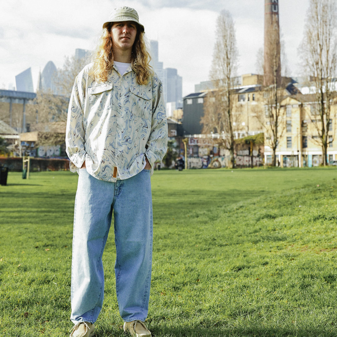 サラッとしつつ表面には質感のある生地に仕上げたアムンゼンクロスを使用したマーブルプリントのセットアップはお馴染みの肩幅、身幅にゆとりを持たせたビッグシルエットシャツとワイドイージーパンツ。